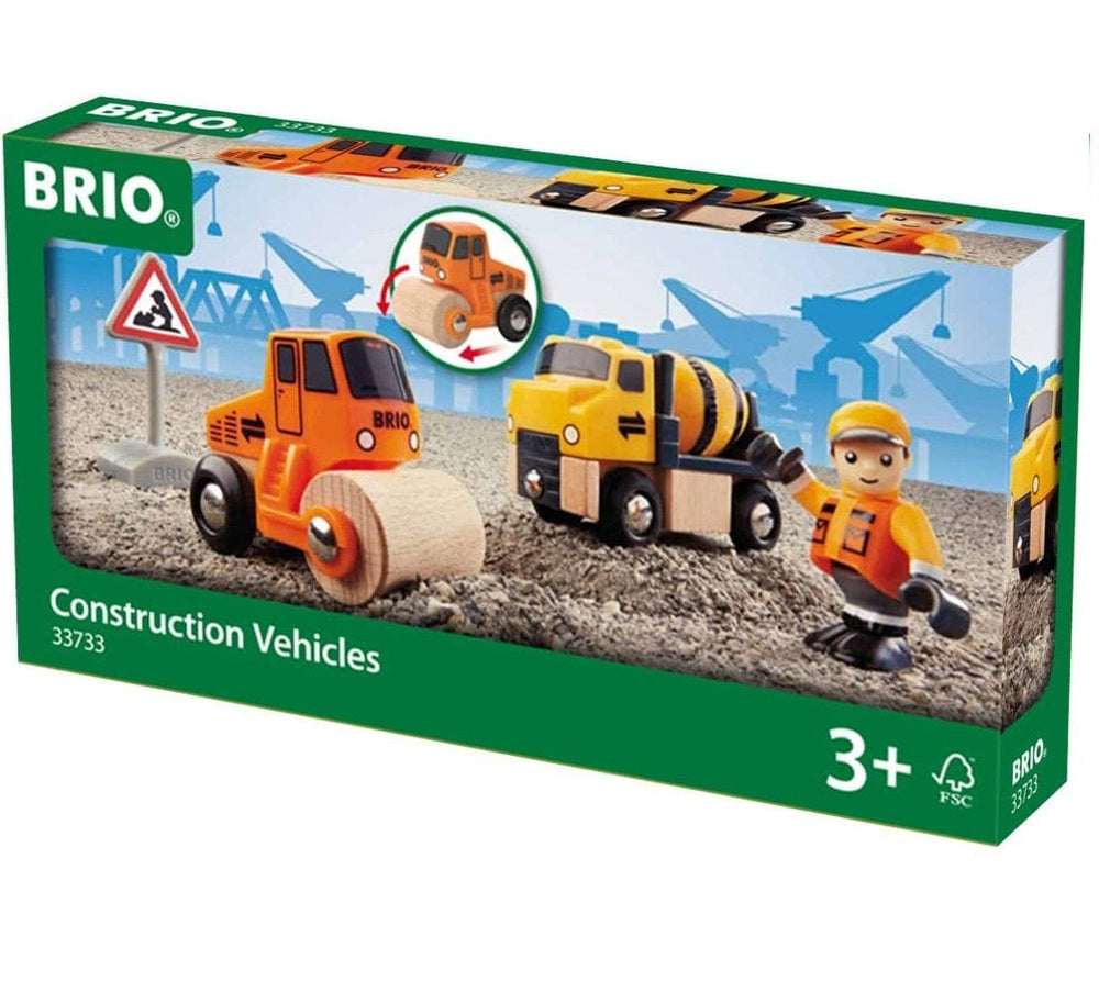 Construction vehicles: This BRIO World vehicle set includes a tipper truck, a steam roller and a loader with tipping wagon – all featuring natural wooden details. There’s also a large pile of concrete to be moved around using the toy vehicles.