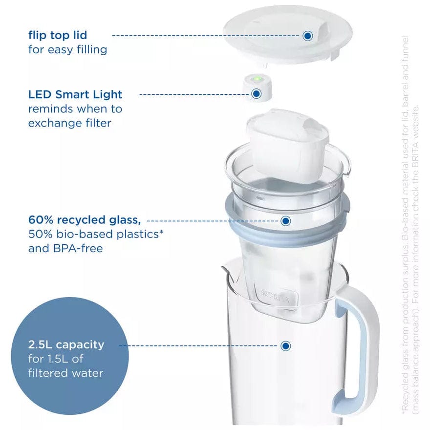 The first BRITA jug made out of glass. A minimalistic design with premium features, helping to do more good for the environment. Features: - Innovative BRITA MAXTRA PRO 4-stage filtration - Made using premium borosilicate glass which is lightweight, robust and heat-resistant - BRITA Smart Light prompts when to replace the filter for optimal filtration results - after 4 weeks or 150L of filtered water - Can be opened with one hand for refilling thanks to the convenient flip-lid - Dishwasher safe (except BRITA Smart light and the silicone ring).