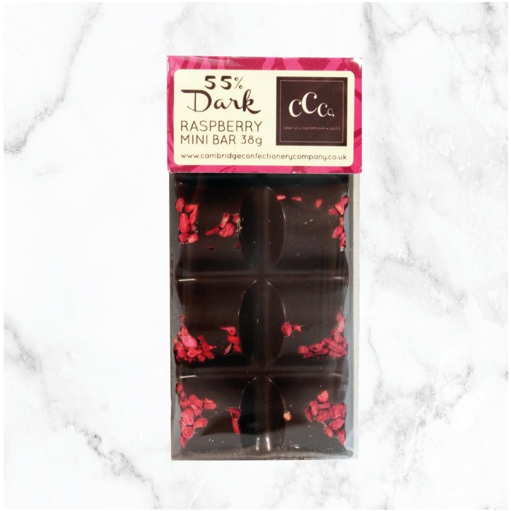 A luxury 55% dark chocolate mini bar with freeze dried raspberries – perfect for that little fix!