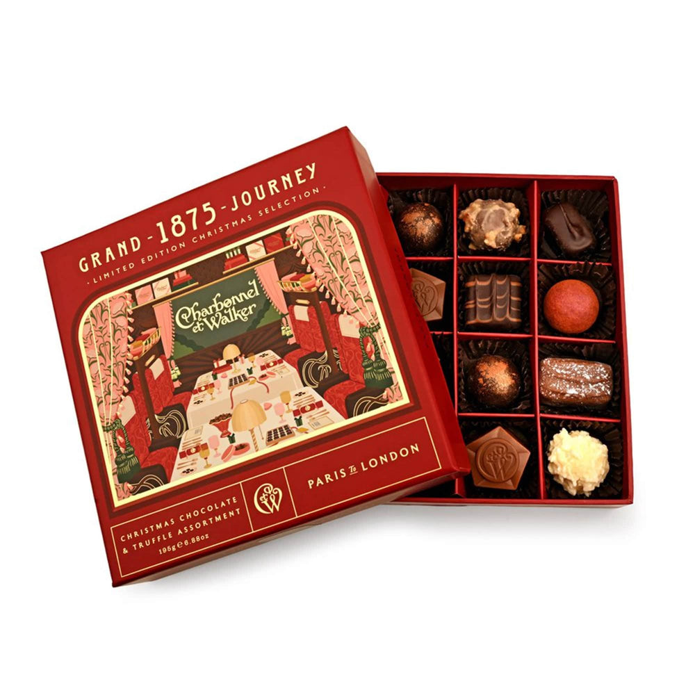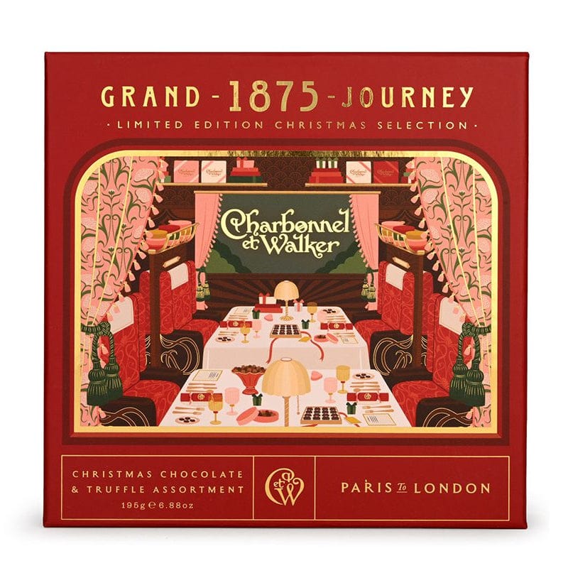 Celebrate a journey of chocolate making history from 1875- 2025. This splendid Milk, Dark and White Chocolate and Truffle Assortment is filled with a sumptuous selection. Enjoy Orange & Cinnamon, Praline Yule Logs, Spiced Raspberry Truffles, Stem Ginger enrobed in Dark Chocolate, Coconut Truffles and more. Take your seats in the Chocolate Carriage with Madame Charbonnel and Mrs. Walker, Paris to London to open their first store on Bond Street in 1875. A delicious destination this Christmas.