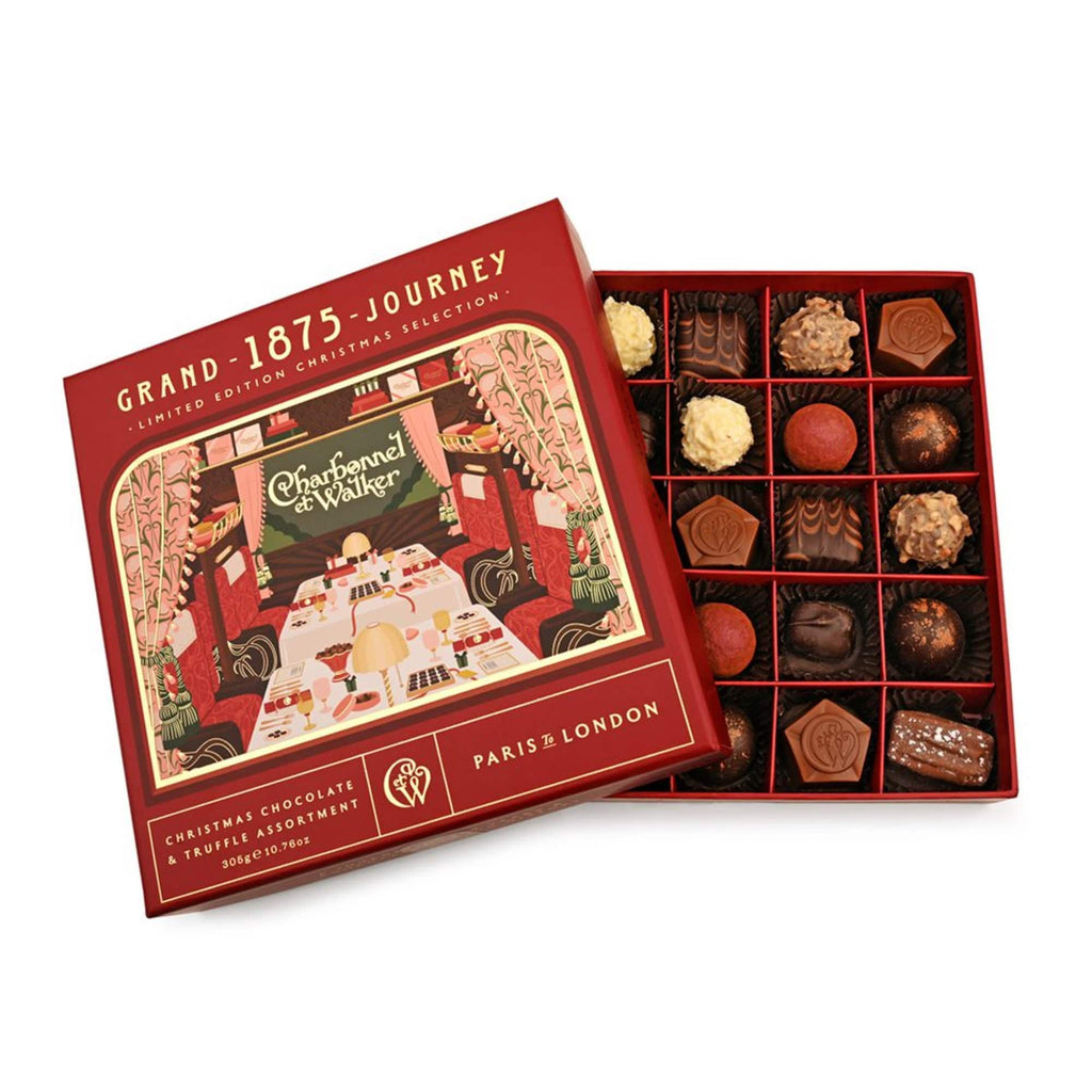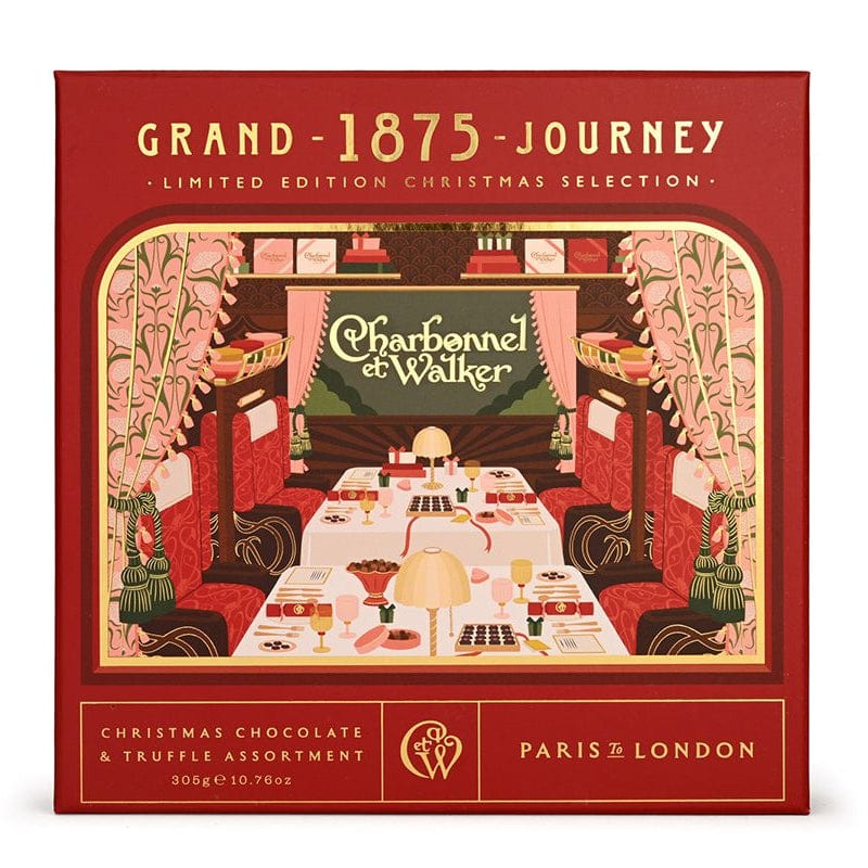 Celebrate a journey of chocolate making history from 1875- 2025. This splendid Milk, Dark and White Chocolate and Truffle Assortment is filled with a sumptuous selection. Enjoy Orange & Cinnamon, Praline Yule Logs, Spiced Raspberry Truffles, Stem Ginger enrobed in Dark Chocolate, Coconut Truffles and more. Take your seats in the Chocolate Carriage with Madame Charbonnel and Mrs. Walker, Paris to London to open their first store on Bond Street in 1875. A delicious destination this Christmas.
