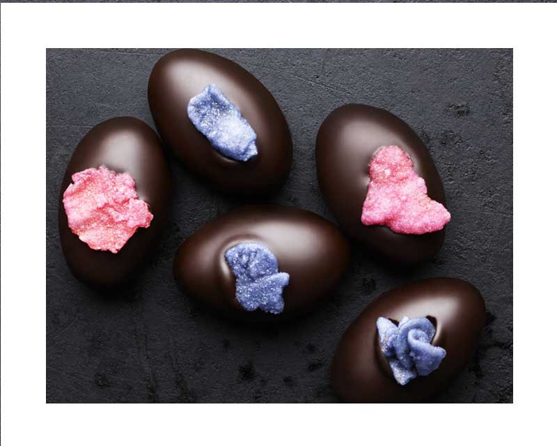 Fondant (sugar, glucose syrup, water), dark chocolate (cocoa mass, sugar, cocoa butter, emulsifier (SOYA lecithin)), sugar, natural flavourings, natural flowers, stabiliser (gum arabic), colours (beetroot red, cochineal, indigo carmine), flavourings.
