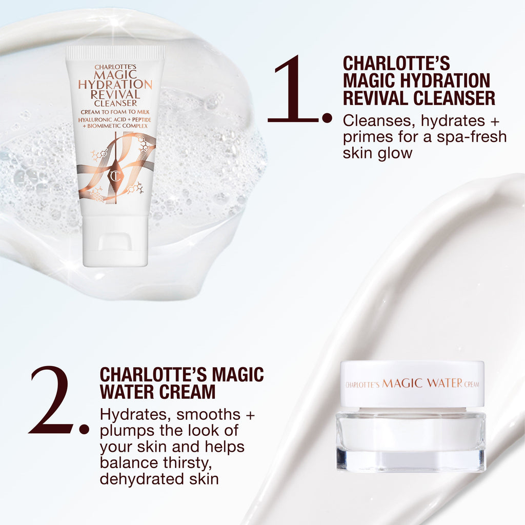Clear away impurities with Charlotte Tilbury Charlotte’s Magic Hydration Revival Duo, a luxurious skincare set designed to cleanse, hydrate and refresh. This powerful duo features Charlotte’s Magic Hydration Revival Cleanser, a three-in-one formulation that transforms from cream to foam to purifying milk. It helps leave the skin feeling fresh, clean, smooth and primed. Created with hyaluronic acid and peptides, it works to deeply hydrate the skin while reducing the appearance of pores.