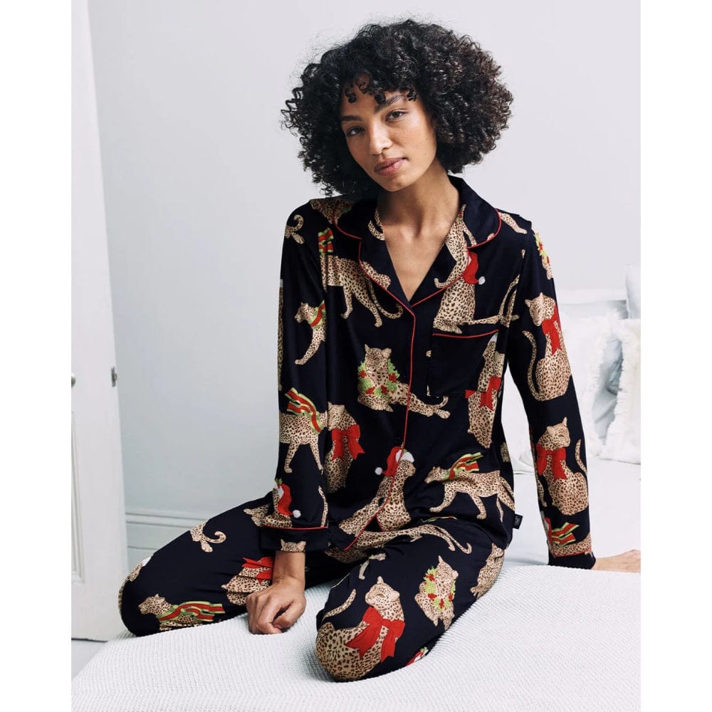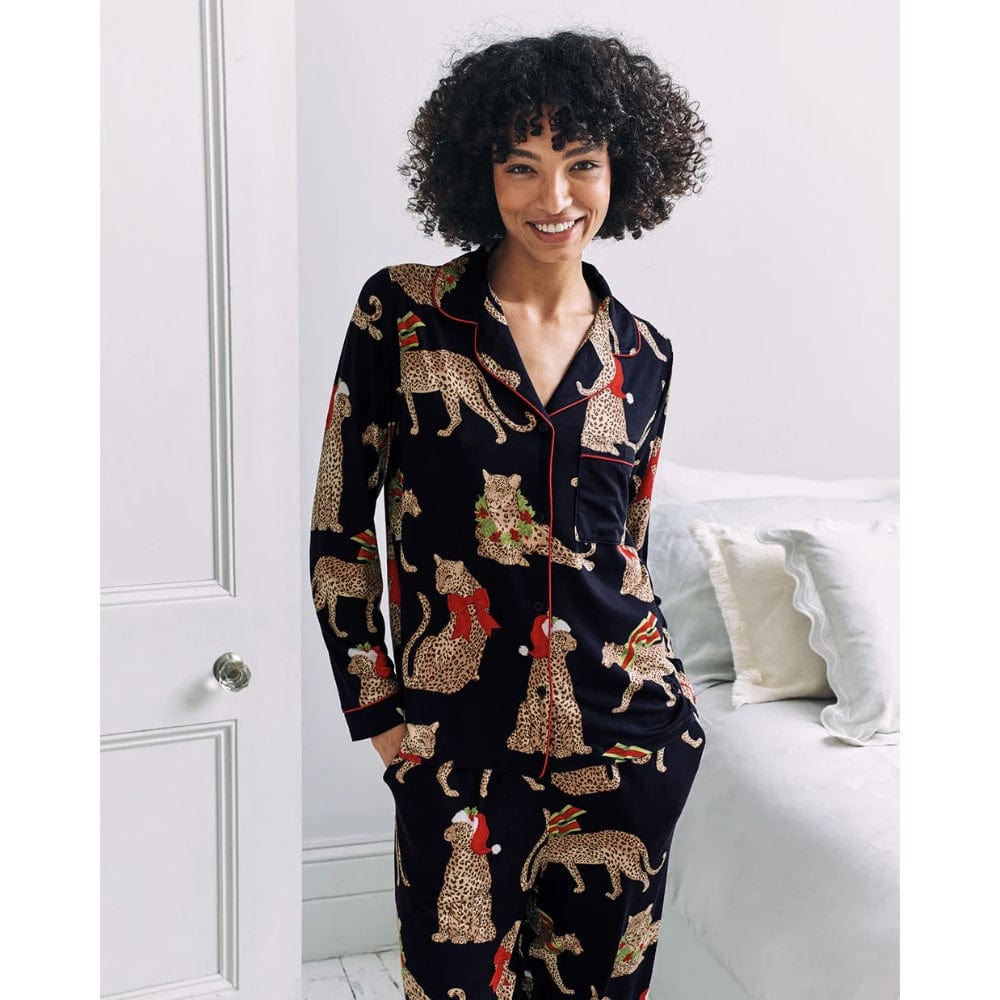 Our signature leopards get dressed for the season in this all-over Christmas print, with one in a Santa hat, another in a striped scarf, and others adorned with holly and ribbon bows. Scattered across a navy base, the design feels festive without being over the top, bringing a polished yet playful touch to Christmas lounging. Crafted in soft recycled jersey, this set features a revere collar, button-up shirt with chest pocket, and relaxed bottoms finished with an elasticated waistband and handy side pockets. Whether it's Christmas Eve, Christmas morning or simply a cosy night in, these pyjamas were made to be part of the memories.
