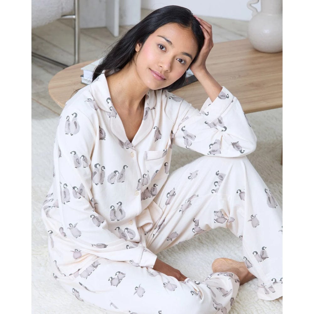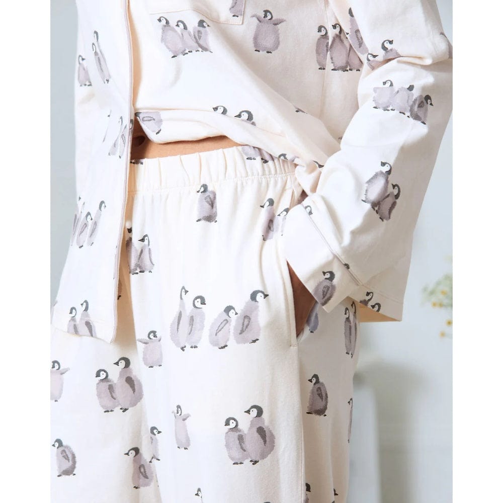 Snuggle up in the playful charm of the Chelsea Peers Organic Cotton Penguin Print Long Pyjama Set. Adorned with hand-drawn penguin chicks on a snowy white base, this cozy set brings a touch of wintry magic to bedtime. Featuring a classic revere collar, tonal piping, a button-up shirt with chest pocket, and elasticated waist bottoms with side pockets, it combines comfort and fun. Made from 95% certified organic cotton, it becomes softer with every wash—perfect for dreamy nights filled with warmth and whimsy.