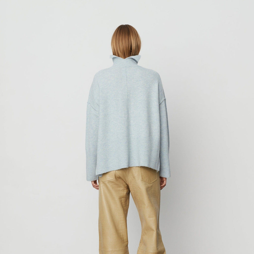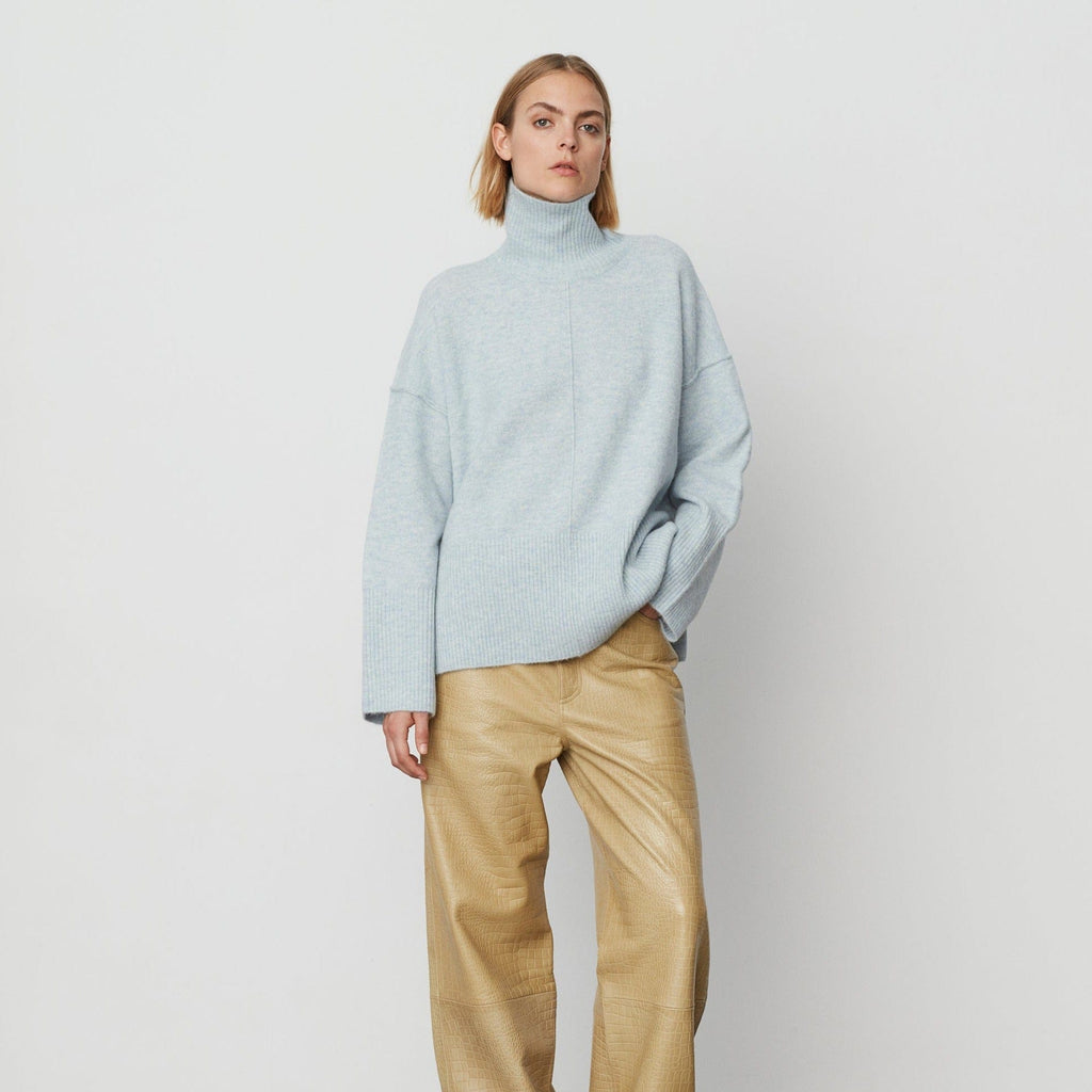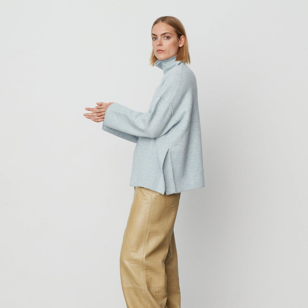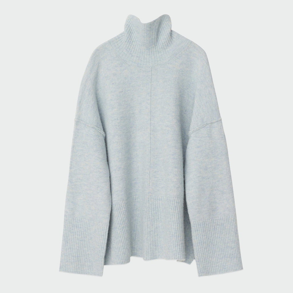 A cream-colored cozy sweater in a wool blend. The sweater has a high collar with a slit at the back, dropped shoulders and ribbed hems. Designed with marked seams and side slits.