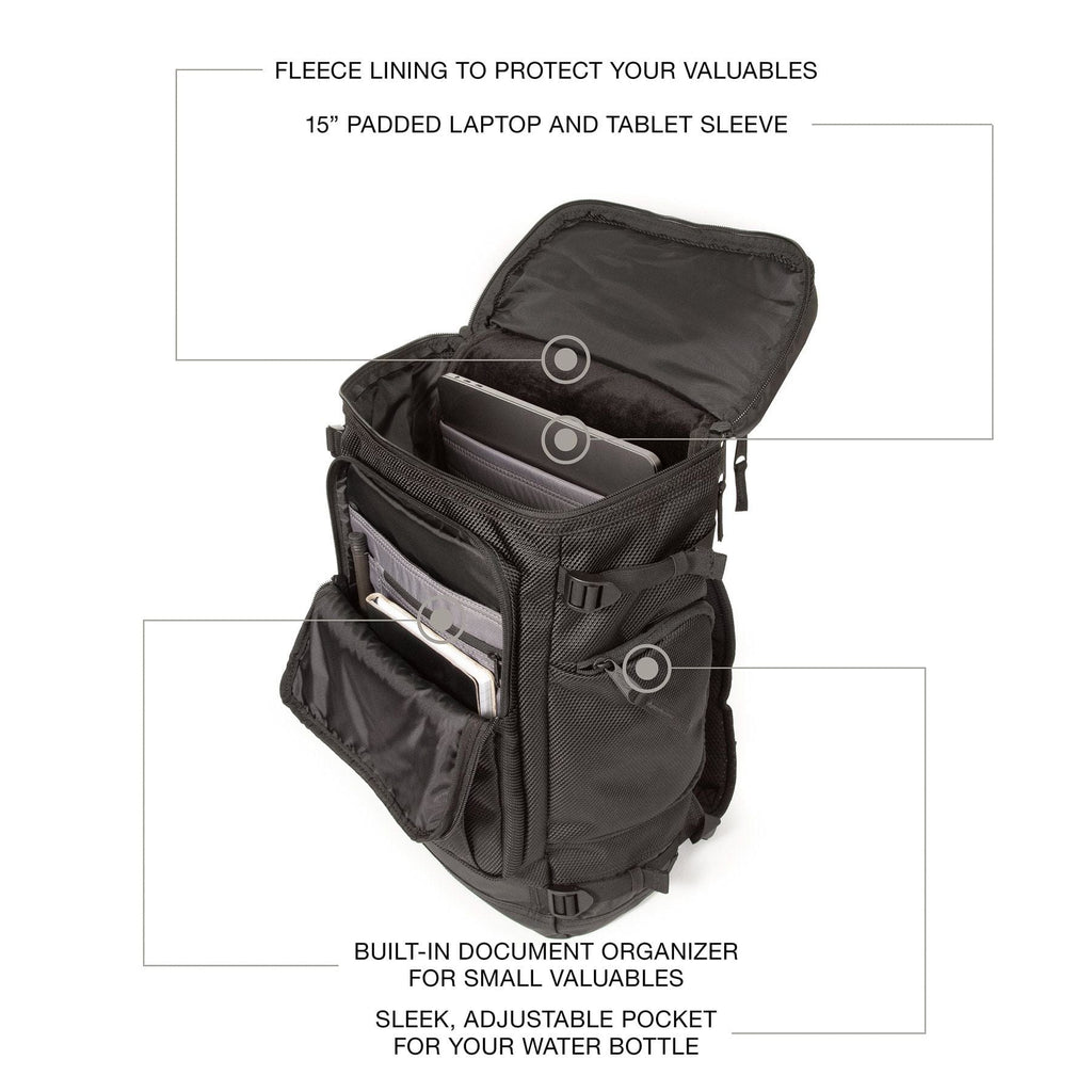 - Top loading main compartment, with separate slots to store your tech