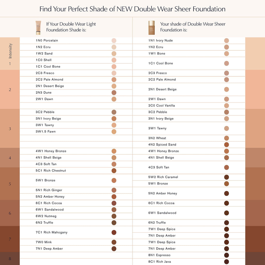 Estée Lauder Double Wear Sheer Long-Wear Foundation SPF20is weightless, fresh-feeling, matte makeup with lasting, all-day long wear. Skin looks healthy, natural, authentic. Visibly perfected with a softly diffused matte finish.