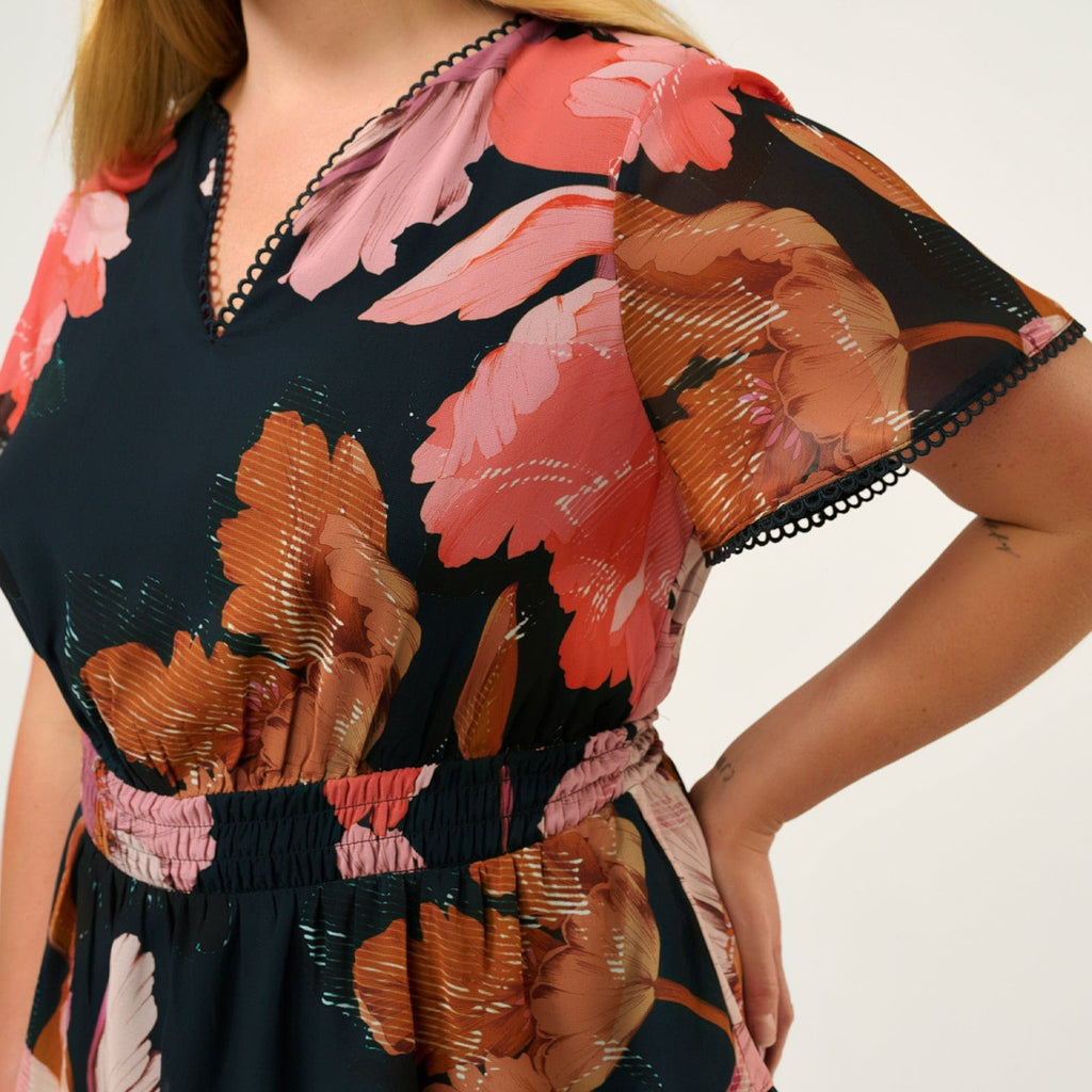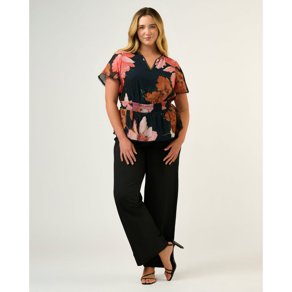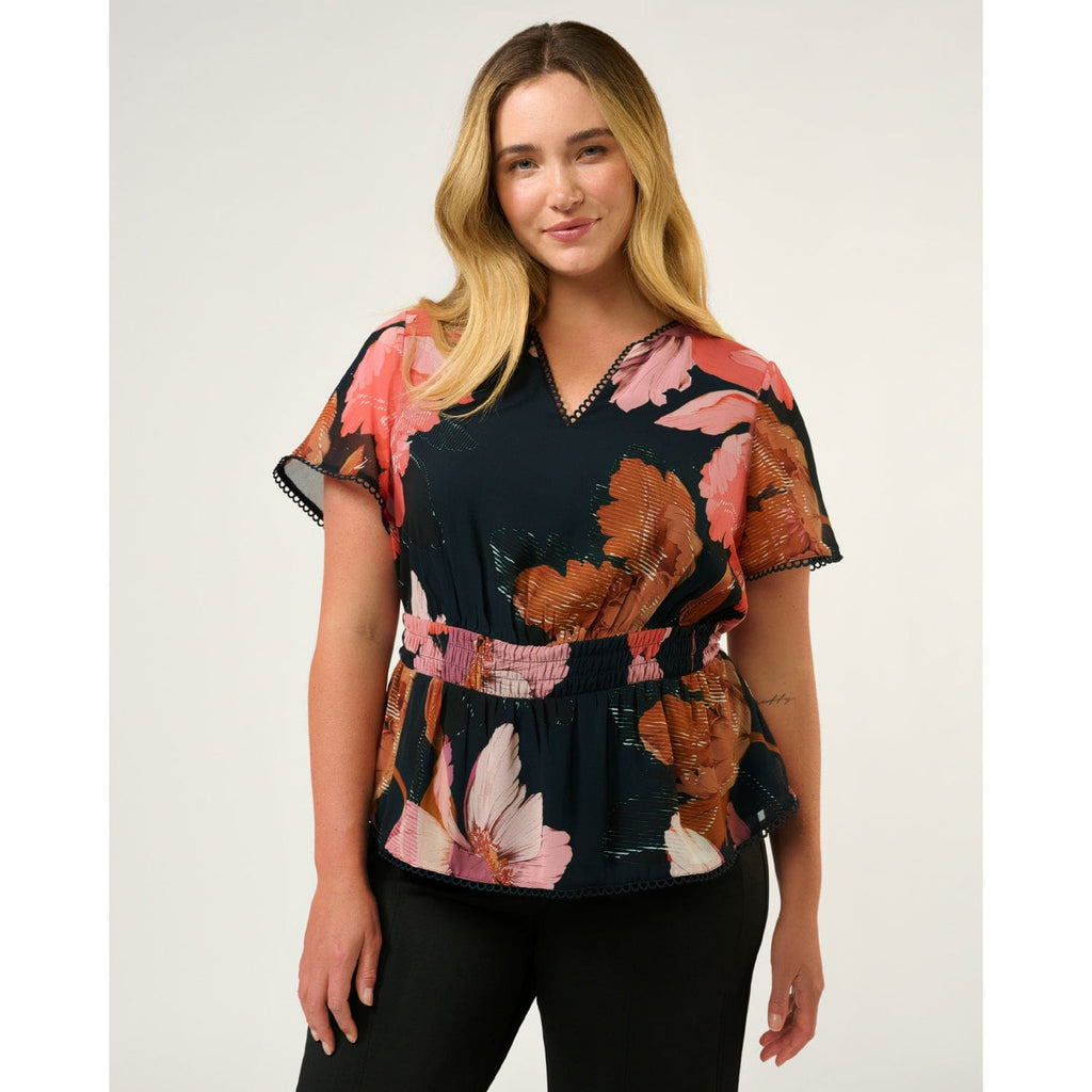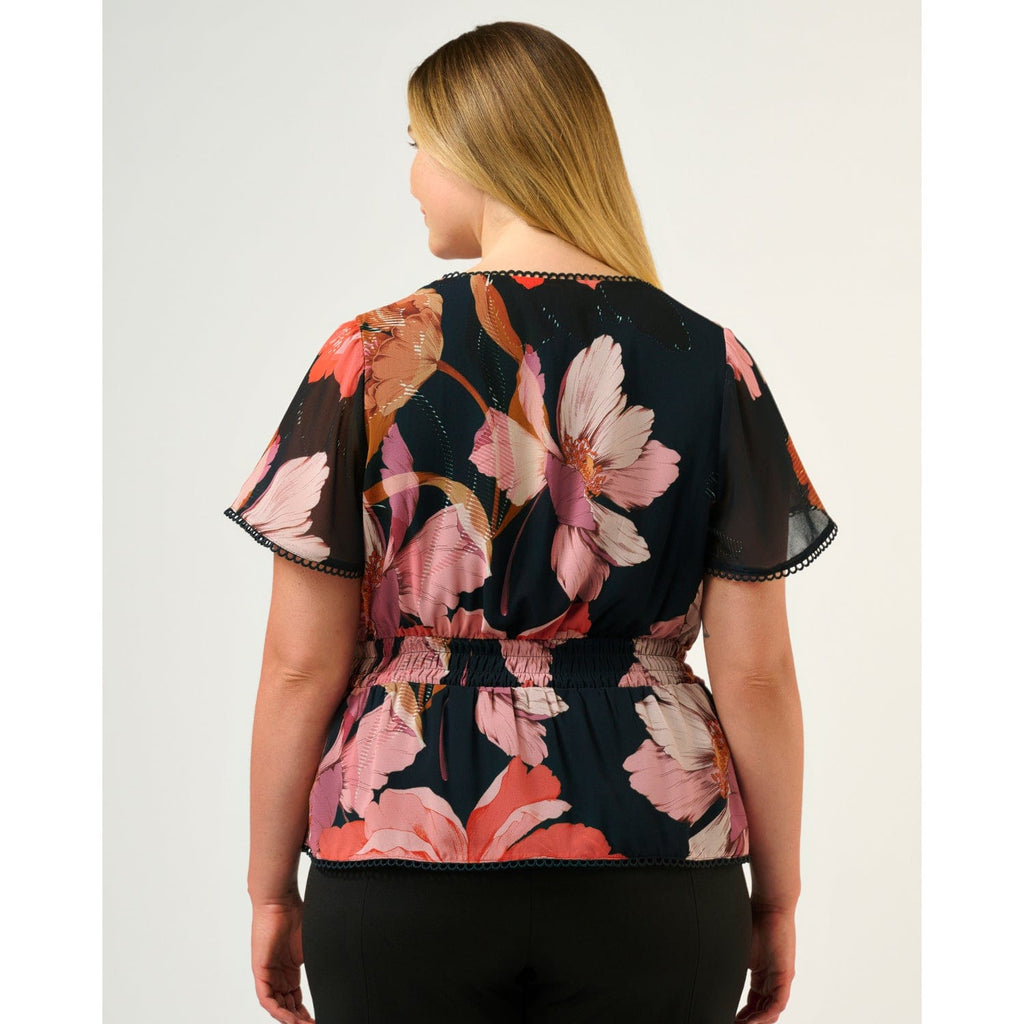 Starring a delicate floral print in navy and pink hues, the Elena Top is a versatile and feminine piece. Crafted from chiffon, this fitted top features a deep V-neck, short flowy sleeves with lace trim, and shirring at the waist, ensuring a comfortable and flattering fit. The elastic waist adds flexibility while maintaining the top's elegant shape. Style with tailored trousers for a polished office look, or pair with a sleek skirt for a chic after-hours ensemble. Perfect for both daytime and evening occasions.