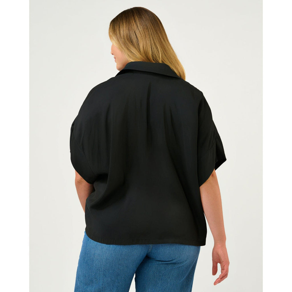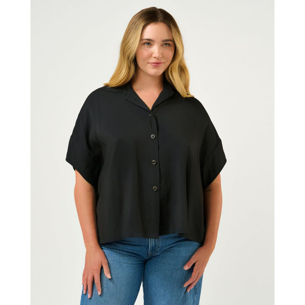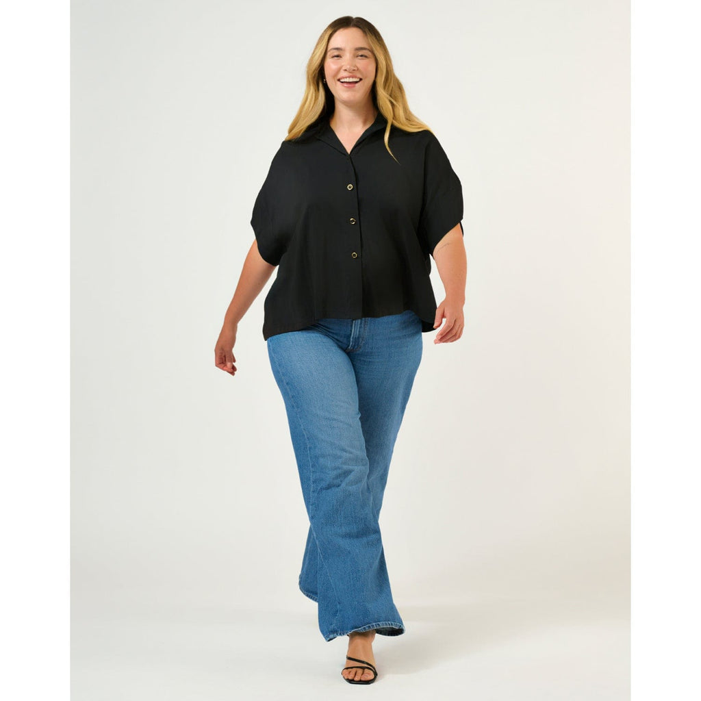 The Lela Top is an oversized black top crafted from soft cupro fabric. Designed with a collared neckline and drop shoulders with cuffs, this relaxed piece offers effortless style and comfort. Perfect for both casual and smart-casual looks, style with tailored pants for the office or jeans for a laid-back after-hours ensemble.