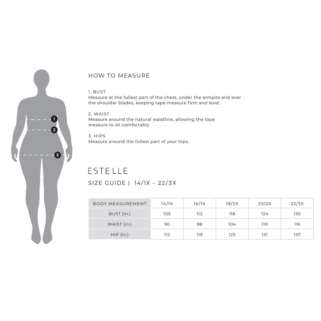 Our model, Chanel, wears a size 14W. She is 175cm (5'9"") tall, has a 104cm (41"") bust, 89cm (35"") waist, and 118cm (46.5"") hips.