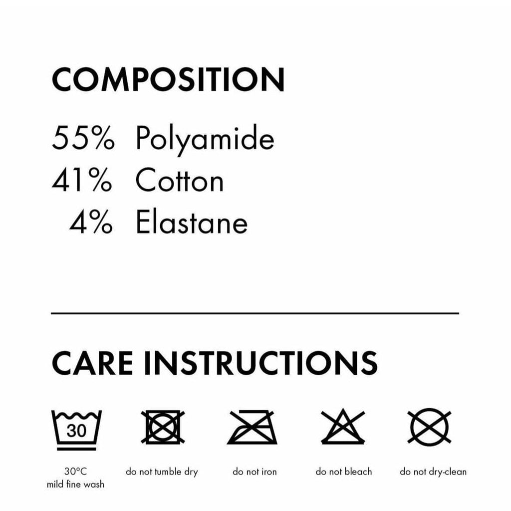 - Material: 55% Polyamide, 41% Cotton, 4% Elastane