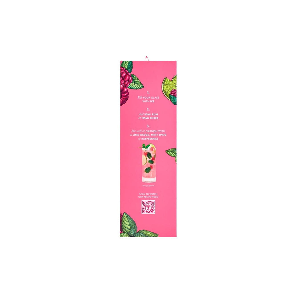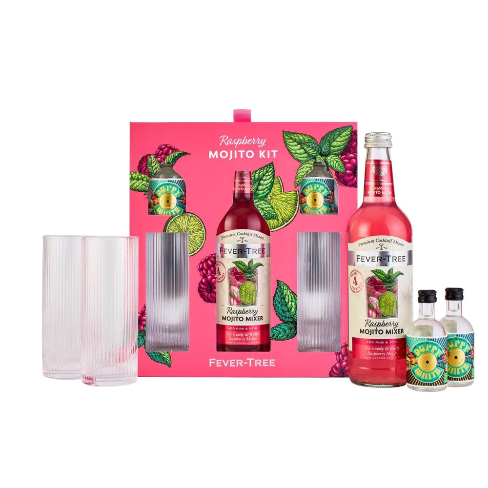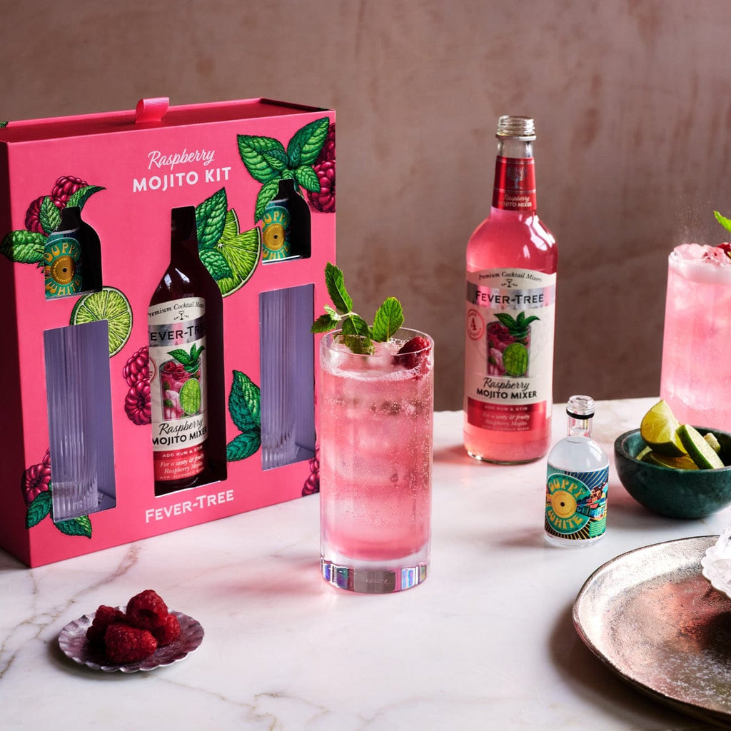 The Ultimate Raspberry Mojito Kit: 2x Duppy White Jamaican miniatures, 500ml bottle of Fever-Tree Raspberry Mojito Mixer and 2x Premium Ribbed Mojito cocktail glasses chosen to elevate your cocktail drinking experience.