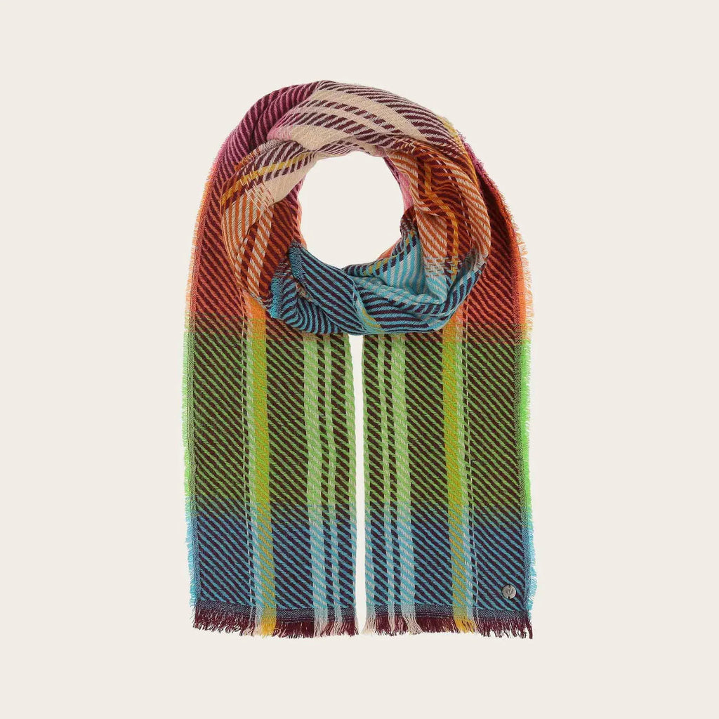 Discover the woven scarf in a retro design with vibrant striped patterns! The high-quality wool blend fabric ensures pleasant warmth and a comfortable feel. The FRAAS scarf (50 x 180 cm) can be combined in a variety of ways - perfect for chilly days. Wear it casually around your neck or elegantly over your shoulders. The horizontal stripes in bright colours and the vertical dark stripes create fashionable accents. A must-have for your look!
