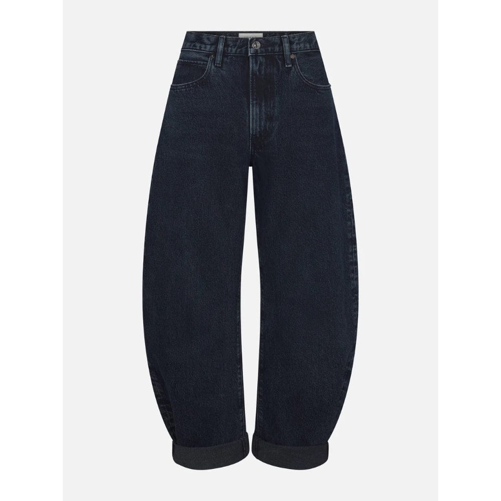 An exaggerated take on the trending barrel silhouette, this unique fit is your new closet necessity. With a flattering high rise, these jeans feature a curved outseam for a playful bubble effect. Designed to be worn cuffed and hit at the ankle, the 2.5" twice-rolled cuff can be unrolled for a longer, more dramatic inseam.