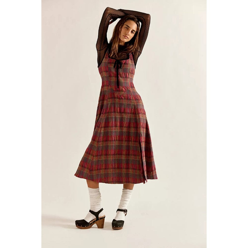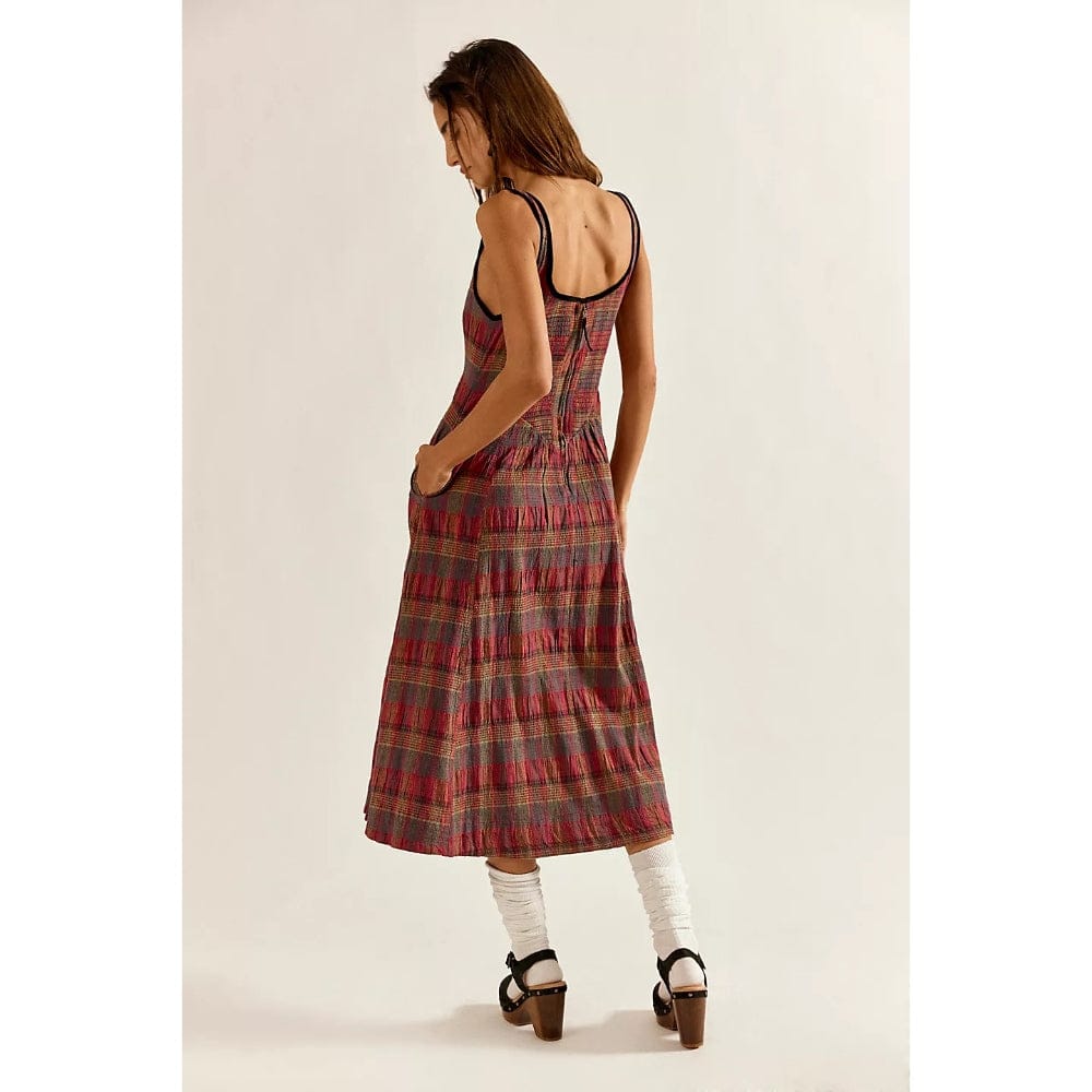 Meet your new wardrobe essential. The Freya Plaid Midi Dress in Cherry Combo. This charming piece blends vintage flair with modern comfort, featuring a soft cotton-blend fabric with subtle ruching that flatters beautifully. The relaxed fit-and-flare silhouette skims the body without clinging, while the classic scoop neckline keeps things effortlessly chic. Sleeveless styling makes it perfect for layering, and practical hidden pockets mean you can actually carry your essentials. A playful bow detail and side slit add personality, while the invisible back zipper ensures a seamless finish.