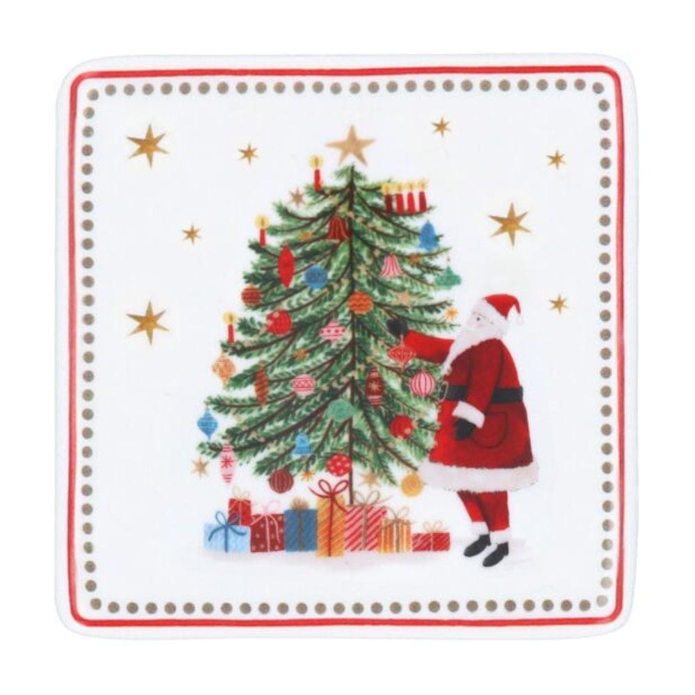 The square porcelain design features a nostalgic, vintage-style illustration of Santa Claus decorating a Christmas tree, surrounded by colourful presents and twinkling gold stars. The reverse is finished with a soft foam backing to help protect your surfaces from scratches while keeping the coaster securely in place.