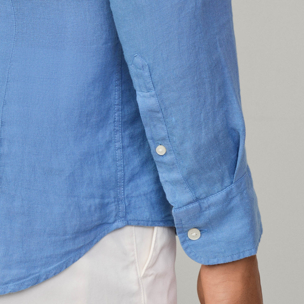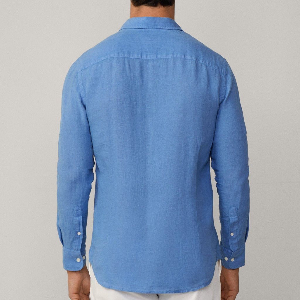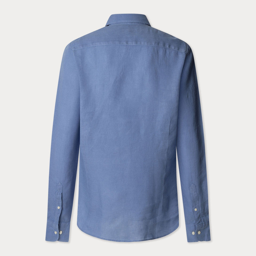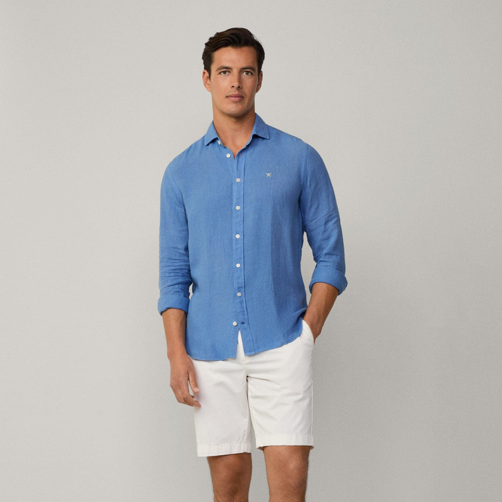 The Essential summer shirt. Garment dyed 100% linen, available in a wide range of seasonal colours. This shirt features a contrast logo embroidery & Kent cutaway collar.
