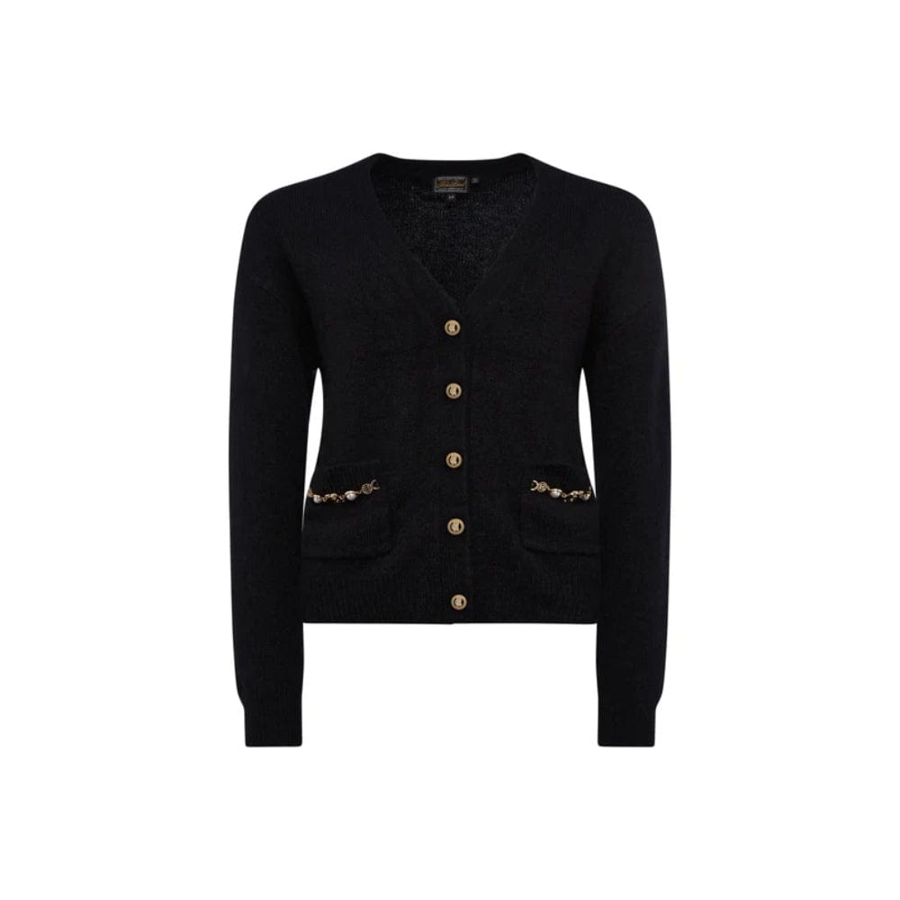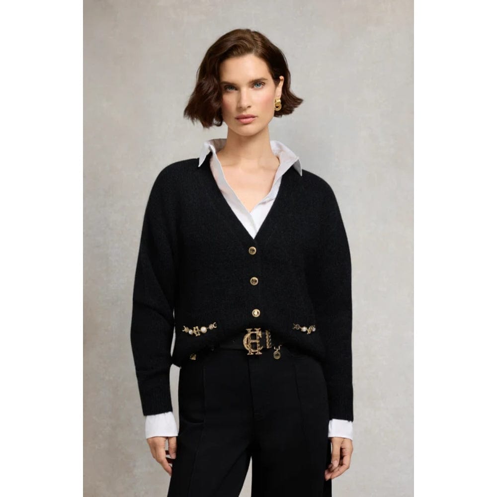 The Holland Cooper Mila Cardigan in Black combines luxurious softness with effortless elegance. Made from a breathable mohair blend, it offers a cosy, lightweight feel perfect for layering. Its relaxed V-neck silhouette drapes gracefully, while gold buttons and signature HC pocket charms enhance a timeless style. Ideal for elevating any outfit with understated sophistication.