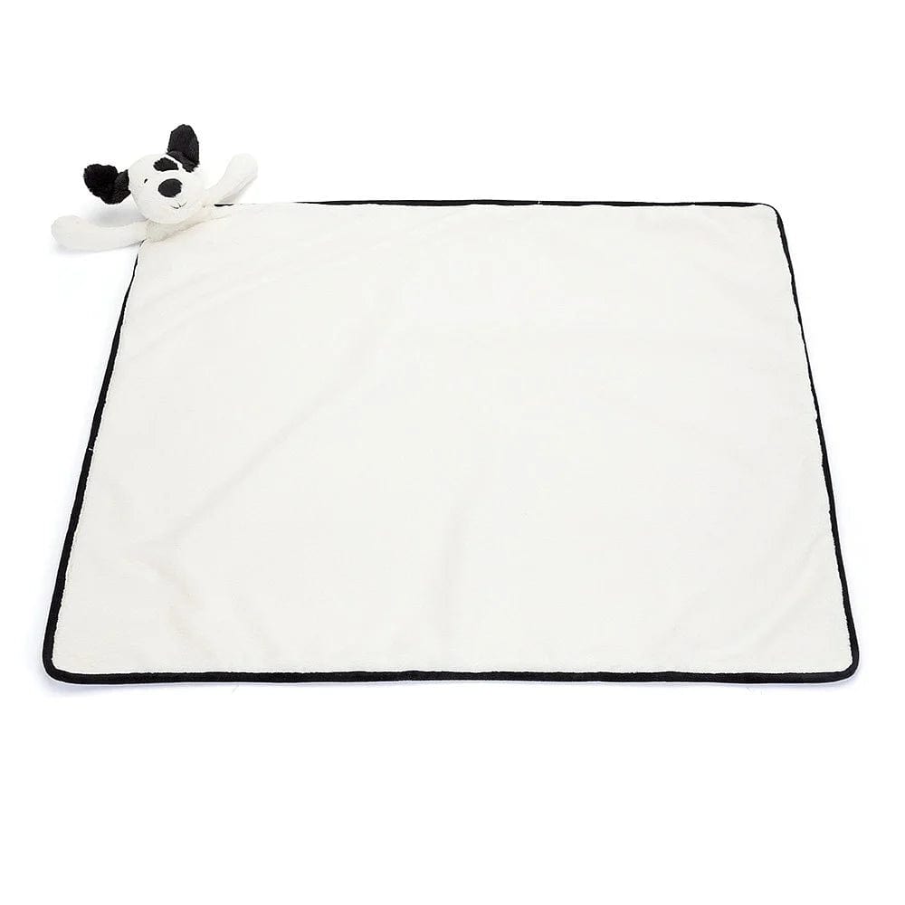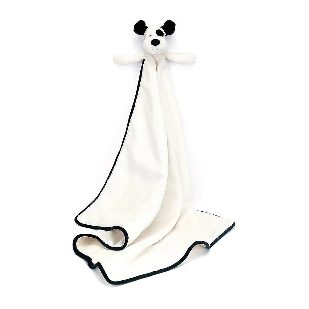 Introducing the delightfully soft and snuggly Bashful Black & Cream Puppy Blankie. Combining our most loved Bashful Puppy’s adorably perky black ears, cream squashy paws and oval squishy nose with a blankie made from the same irresistibly soft fur made of recycled fibres. Neatly rolled and tied with a Baby Jellycat grosgrain ribbon, this is an endearing gift full of comfort and companionship.