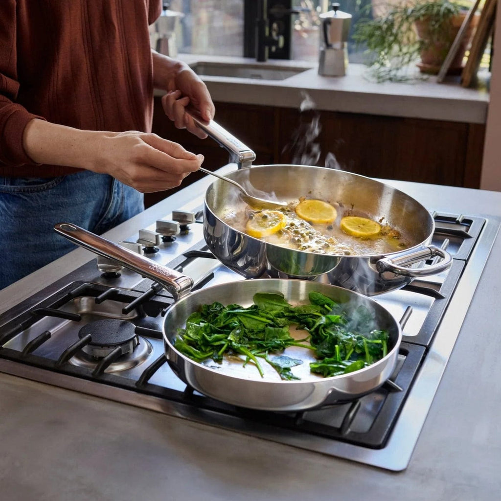 - Polished stainless-steel exterior with an even-heat aluminium core.