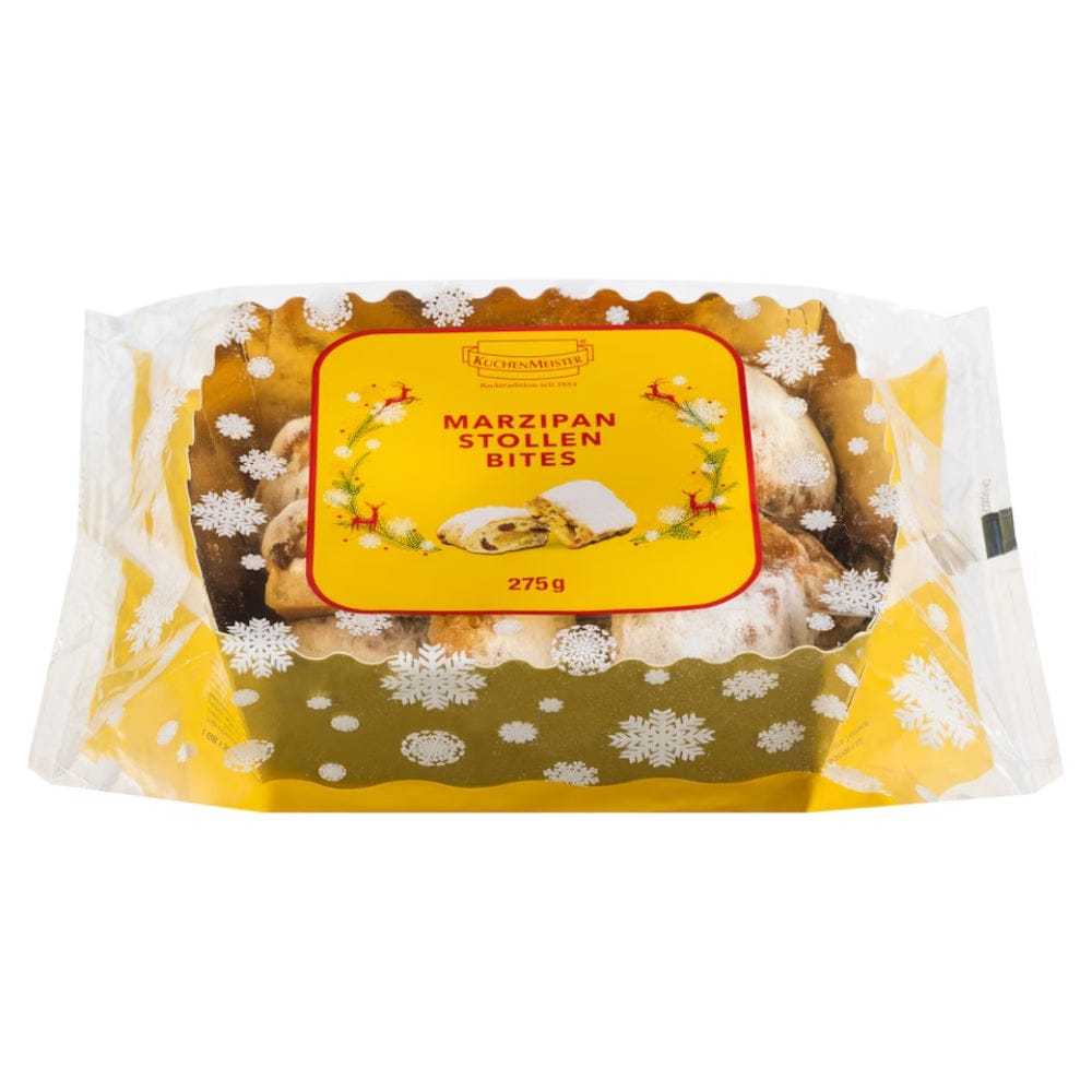 Bite into pure festive magic with Kuchenmeister Marzipan Stollen Bites. These delightful 275g portions capture the essence of traditional German stollen. Soft, buttery cake studded with dried fruits and crowned with a luxurious marzipan centre. Perfect for sharing (or not!), each bite delivers that unmistakable blend of warm spices and creamy almond goodness. Whether you're dunking them in coffee, gifting them to fellow stollen lovers, or sneaking them straight from the box, these little treasures bring authentic Continental charm to your table. A taste of tradition in every morsel.