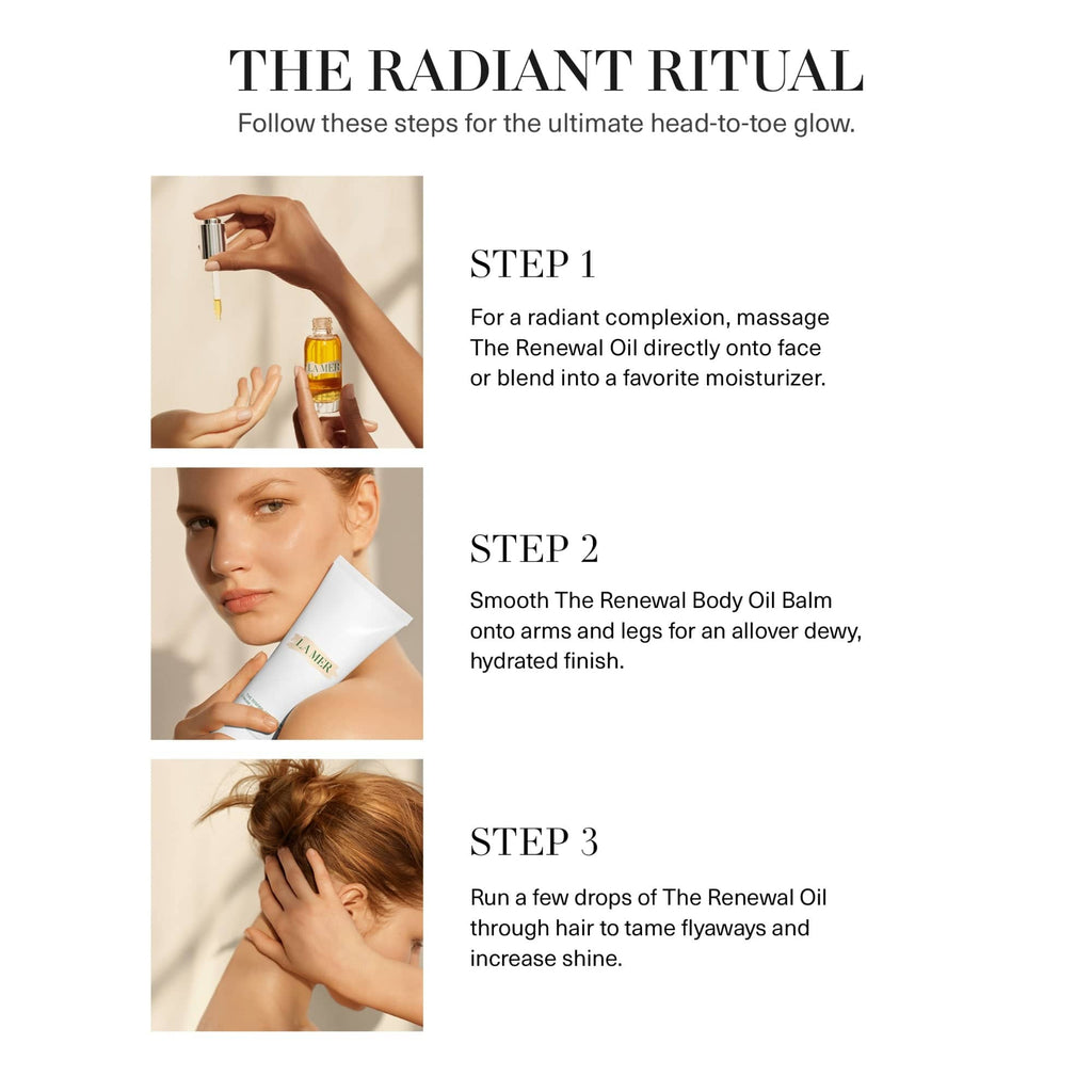 The hydrating, head-turning radiance of The Renewal Oil, reimagined in an all-over body balm that invigorates the body and senses. Every sumptuous touch wraps skin in a wave of nourishing hydration and the kiss of a gorgeous, healthy-looking sheen. This rich, lightly scented balm melts into a silken oil on contact to create the radiant, glowing look of La Mer all over.