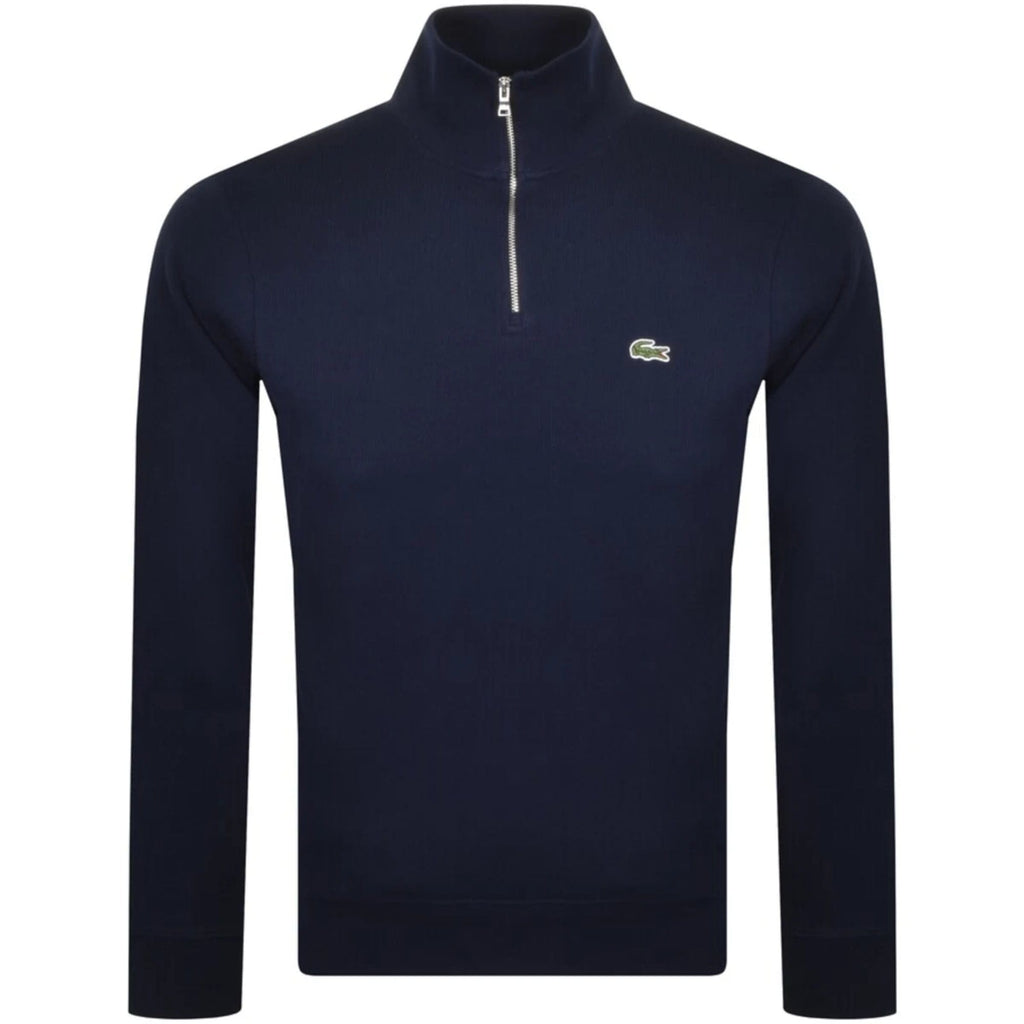Lacoste Half Zip Logo Sweatshirt In Navy. A ribbed stand up collar featuring a half zip fastening with ribbed cuffs on the long sleeves and a ribbed waistband. The signature Lacoste Crocodile woven logo badge is situated on the left of the chest. Top stitching in navy.