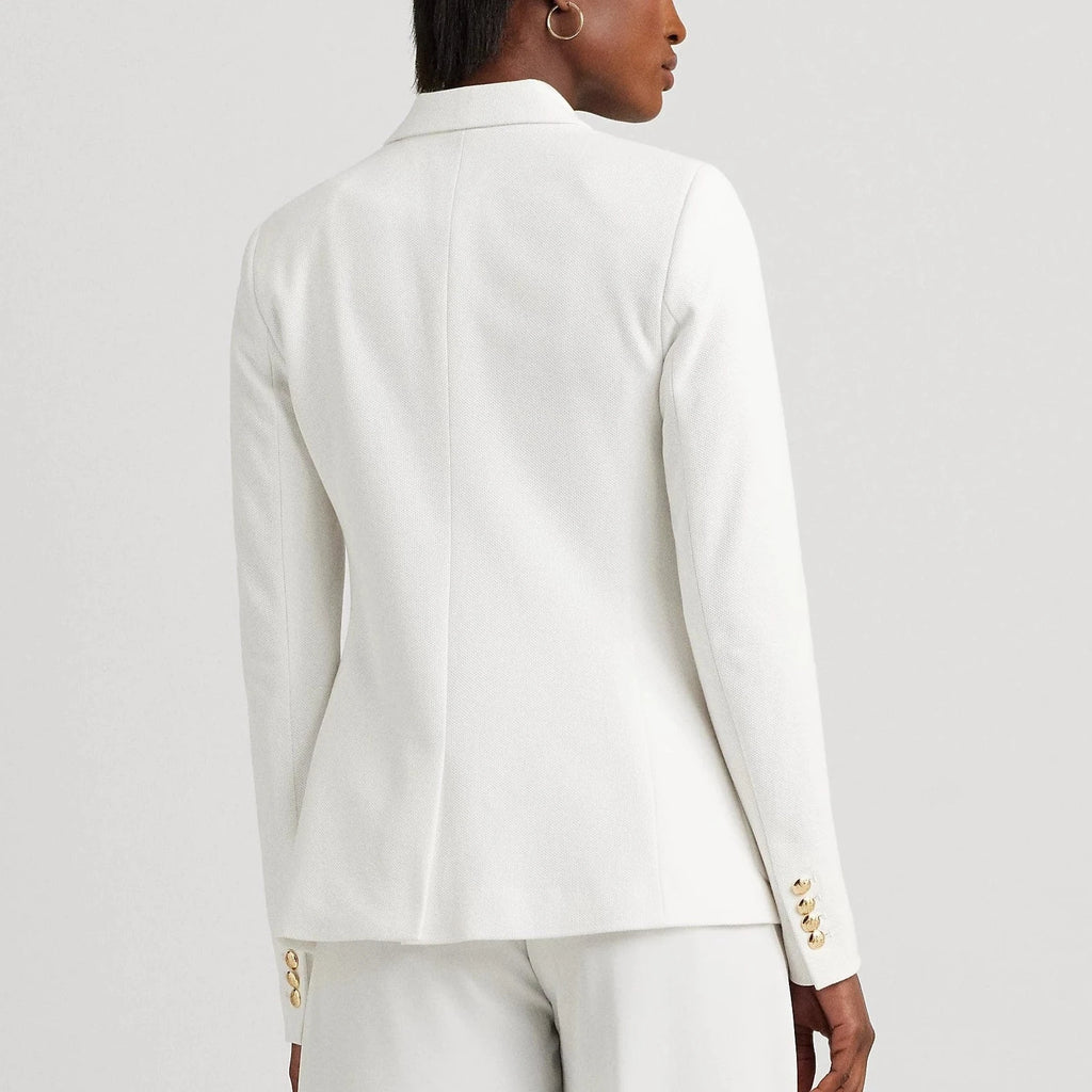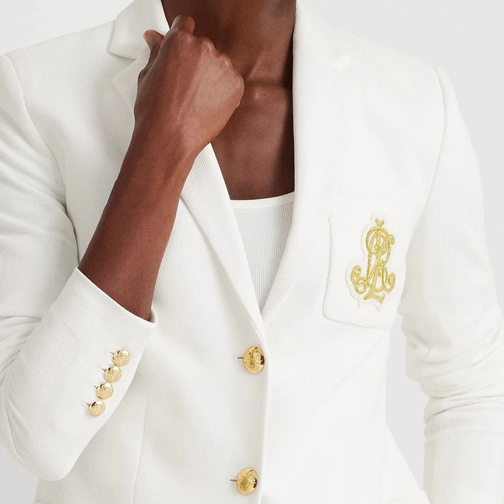 This chic jacquard blazer embodies Lauren style with a signature bullion patch on the chest and luxurious crest-embossed buttons.