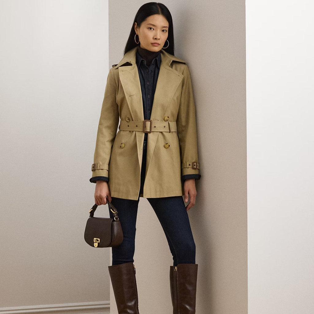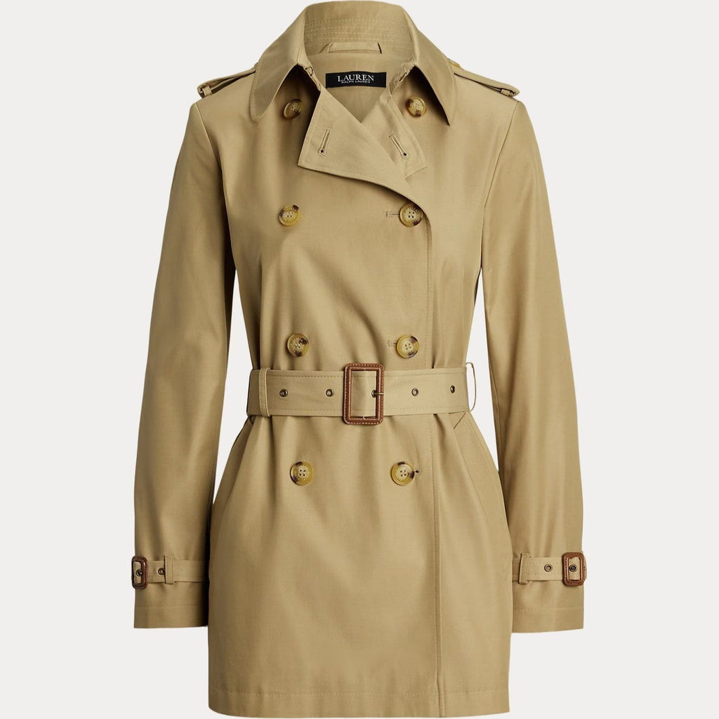 Tailored with a soft, lightweight cotton-blend fabric, this version of the timeless trench coat highlights traditional styling elements, including a double-breasted design, a back storm flap, and buttoned shoulder epaulets. A buckled self-belt accentuates its streamlined silhouette, while “Lauren Ralph Lauren”-engraved buttons lend a signature finish.