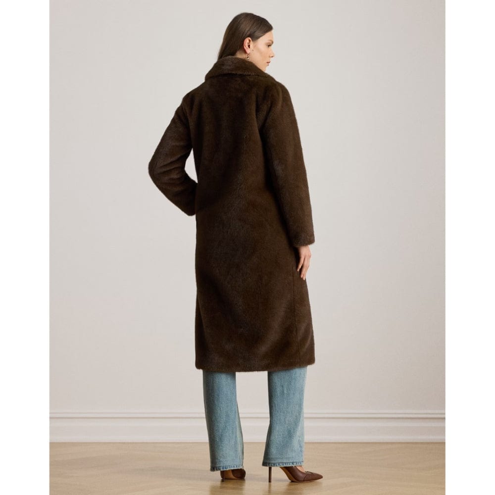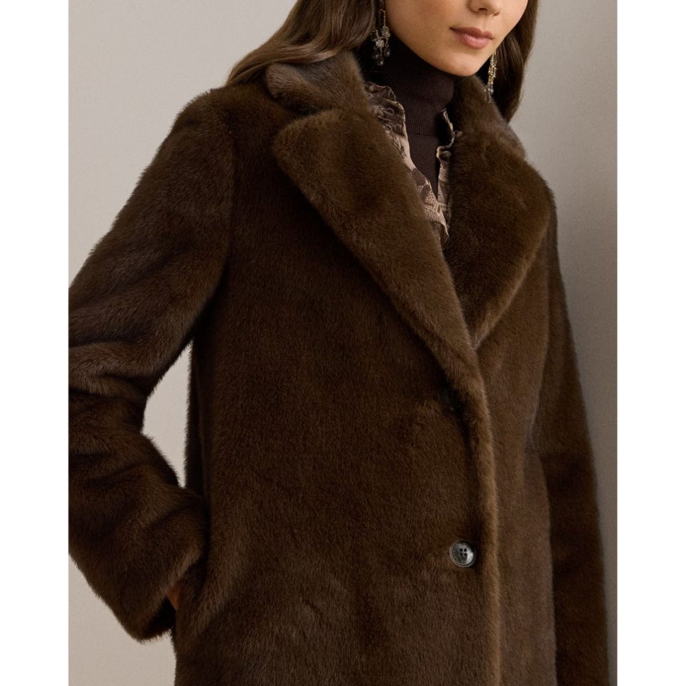 A cosy staple for the cool-weather season, this coat unites a streamlined two-button silhouette and notch lapels with a plush faux-fur fabrication. “Lauren Ralph Lauren”-engraved horn-effect buttons complete the look.