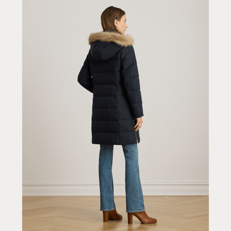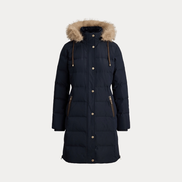 Equal parts stylish and practical, this channel-quilted coat is designed with a detachable, faux fur–trimmed hood, a water-resistant shell, and cozy 450-fill-power down to keep you dry and warm. Front and back princess seams enhance this style’s streamlined silhouette, while “LRL”-engraved metal snaps add signature style.