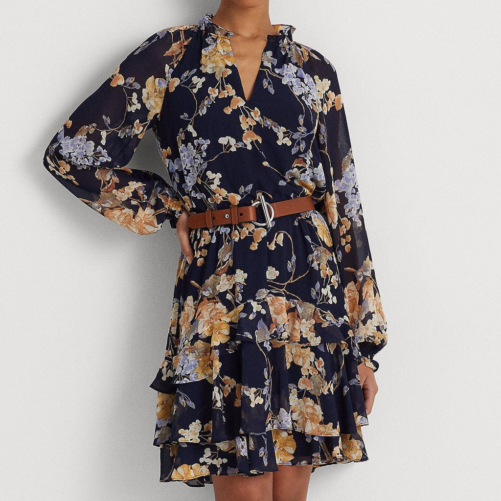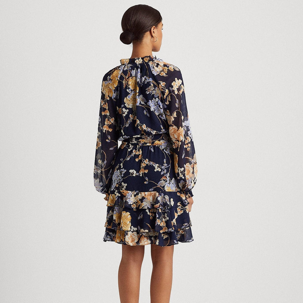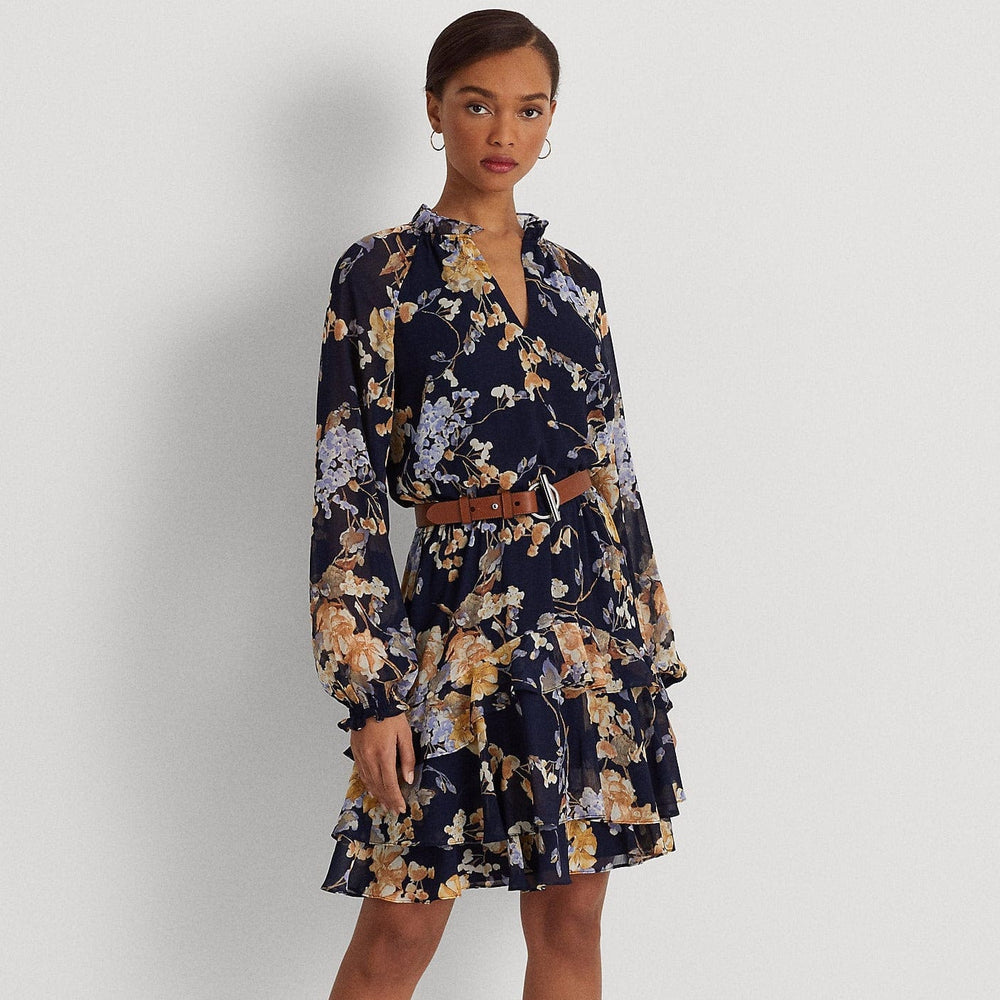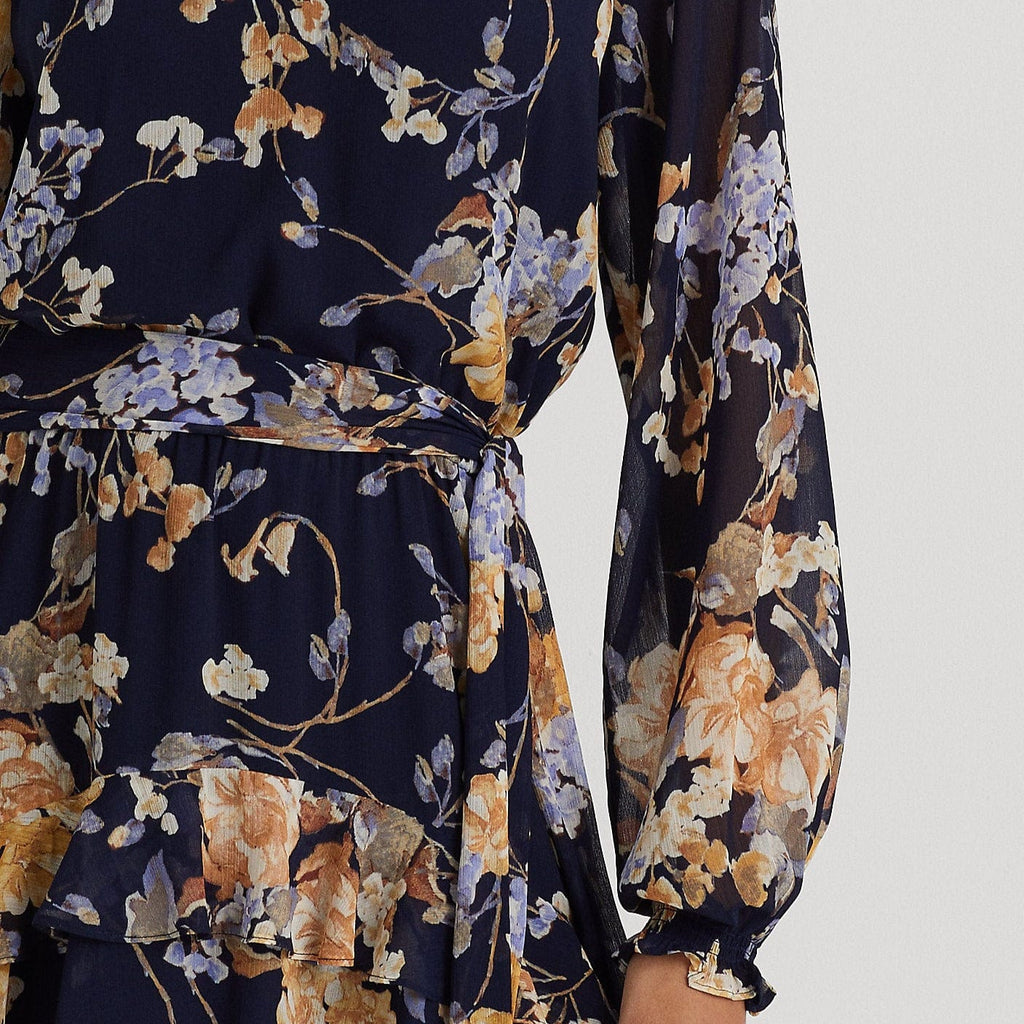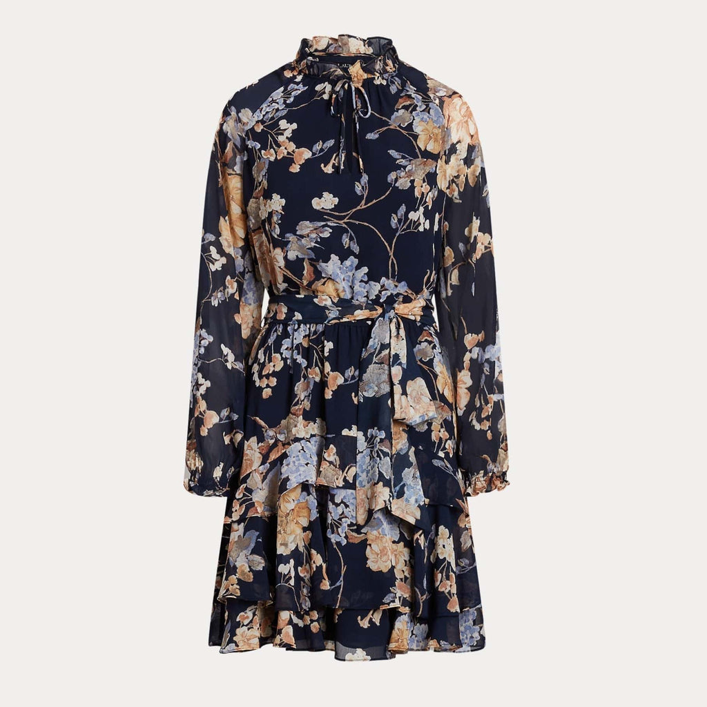 The season's painterly floral motif, blouson sleeves and ruffle trim define the romantic character of this tie-neck dress, while crinkle georgette and a tiered skirt create graceful movement with each step. It's finished with a self-belt that accentuates the waist.