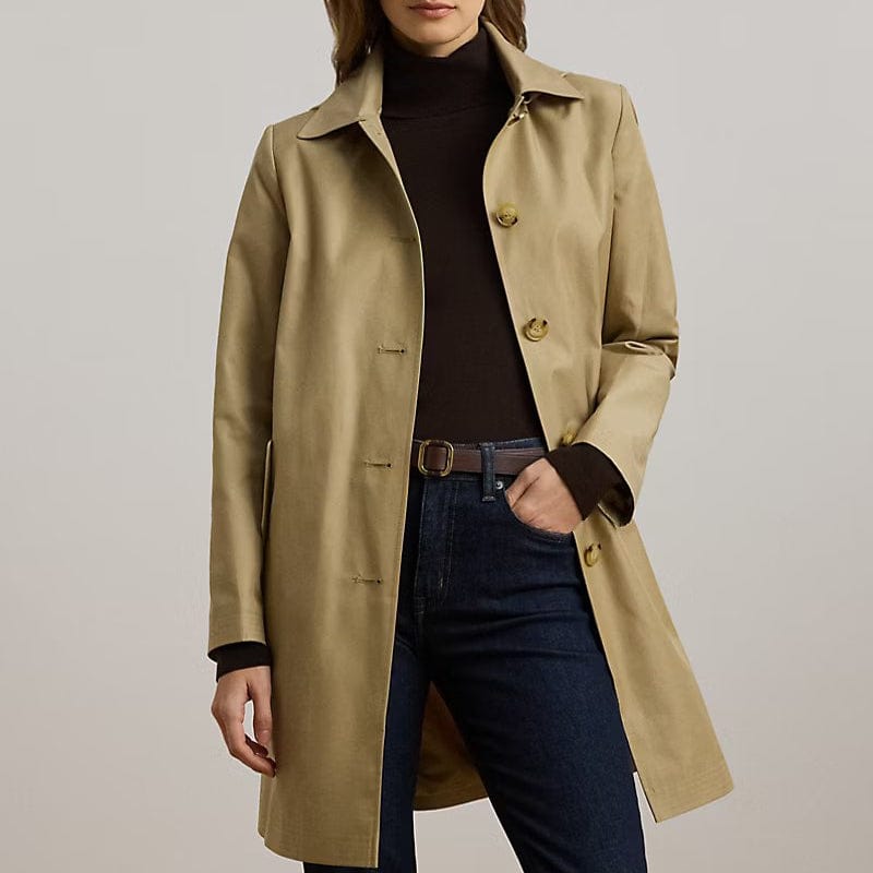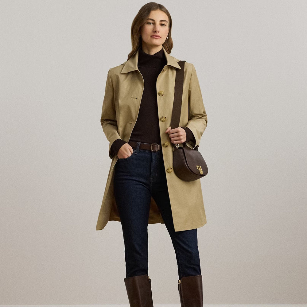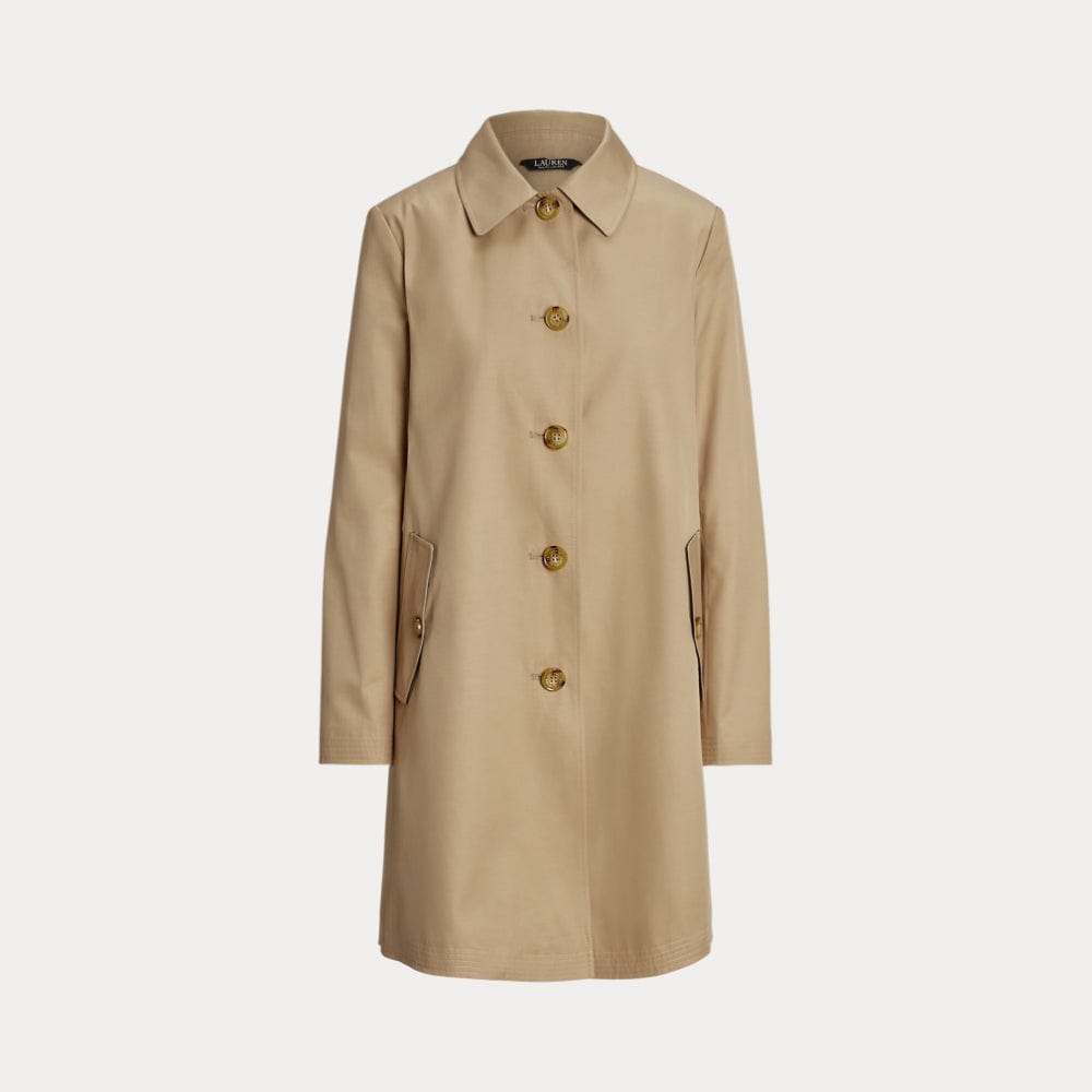 With a water-repellent cotton-blend shell and a menswear-inspired balmacaan coat silhouette, this piece seamlessly merges practical design elements with sophisticated sartorial details. A detachable hood offers versatility, while "Lauren Ralph Lauren"-engraved horn-effect buttons add a signature finish.