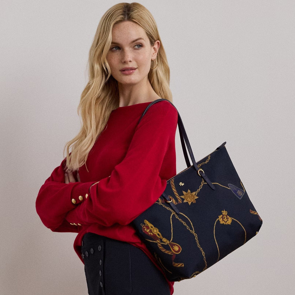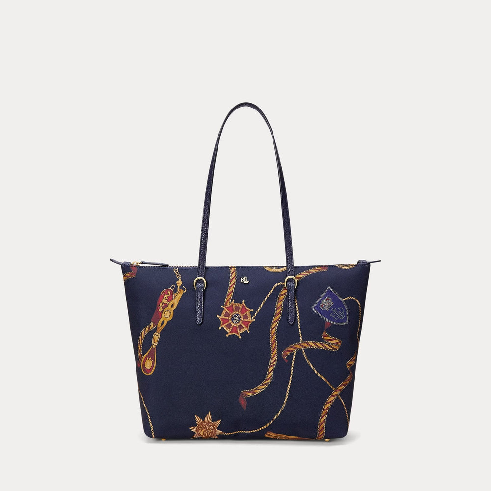 Crafted with durable nylon and designed with sumptuous faux-leather straps, the medium Keaton tote features a spacious silhouette, perfect for carrying the day's essentials. A versatile must-have, it's finished with an "LRL" metal logo on the front for signature style.
