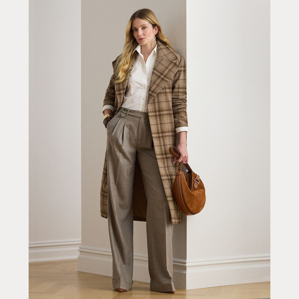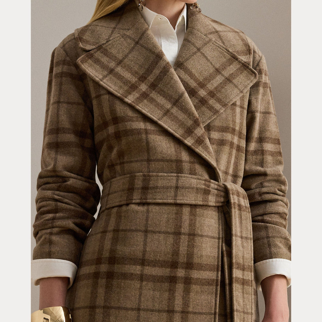 Oversize notch lapels, a timeless plaid pattern, and soft wool-blend twill define the elegant appeal of this overcoat. A belted waist completes its wrap silhouette.