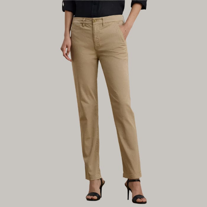 Introducing the Lauren Ralph Lauren Slim Fit Stretch Chino Trouser! Made with left-hand twill and added stretch, these chinos offer a comfortable and flattering fit. Designed with a tapered, cropped leg and mid-rise, they hit just above the ankle for a stylish look. With belt loops, multiple pockets, and a chic buttoned closure, these are the perfect addition to your wardrobe.