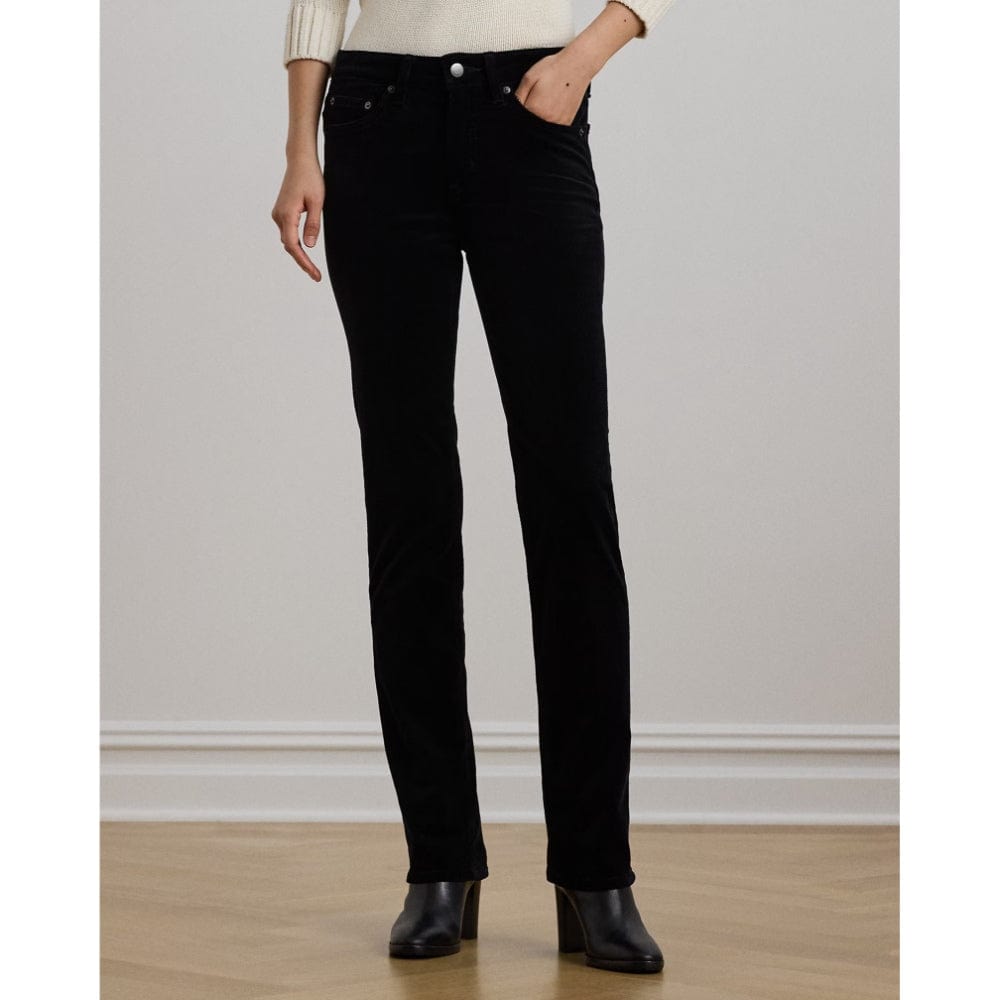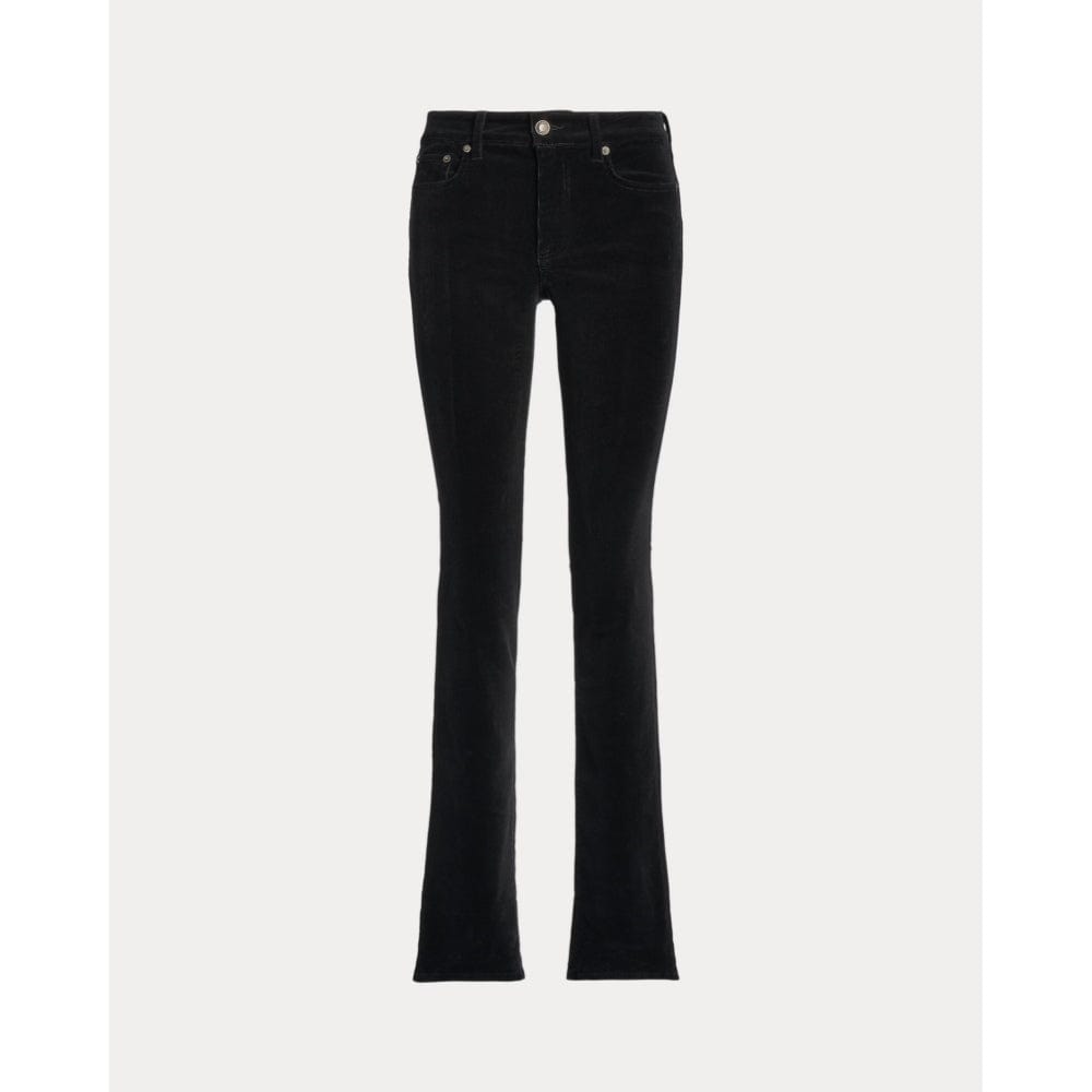 These mid-rise trousers in black stretch-infused corduroy offer a straight, streamlined silhouette with subtle texture for everyday elegance. Sitting at the natural waist, they are slim through the hip and thigh and feature a straight leg. Designed with belt loops, a zip fly with signature button closure, and five-pocket styling with metal rivets, they are finished with a debossed leather logo patch on the back right waist. The shell and lining are 98% cotton and 2% elastane, with a 100% leather logo patch.