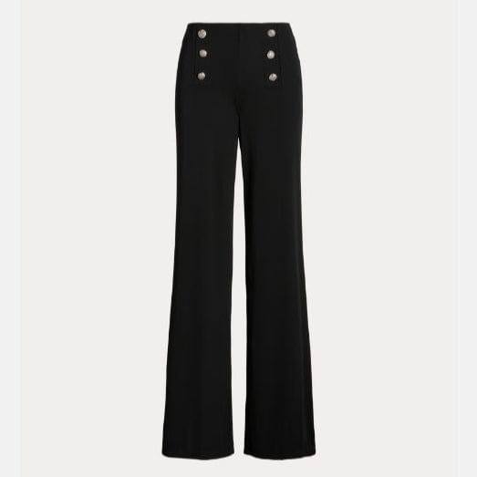 Unleash effortless elegance with these navy high-rise trousers from Lauren Ralph Lauren. Made with stretch matte jersey for fluid movement, these trousers feature a wide-leg silhouette designed to fall gracefully to the floor. Adorned with polished crest-embossed buttons, they exude a luxurious and sophisticated feel.