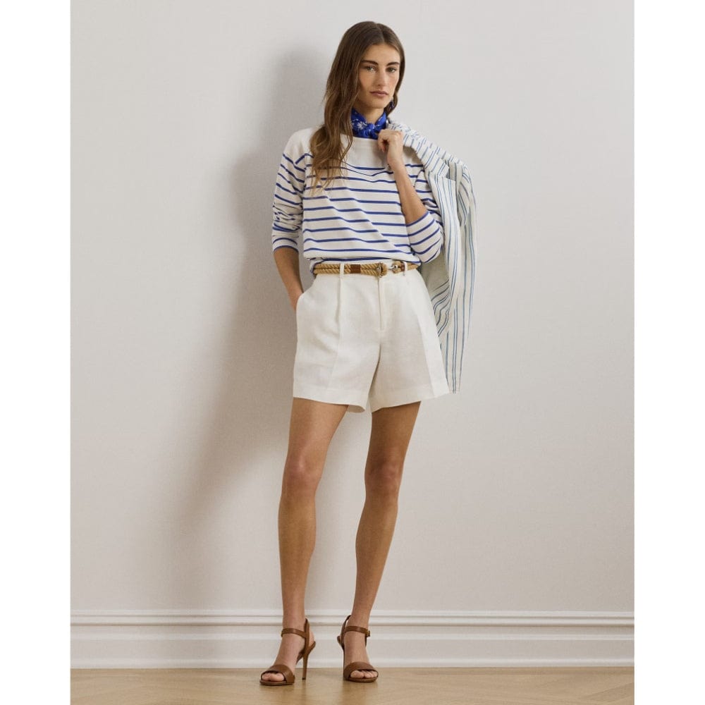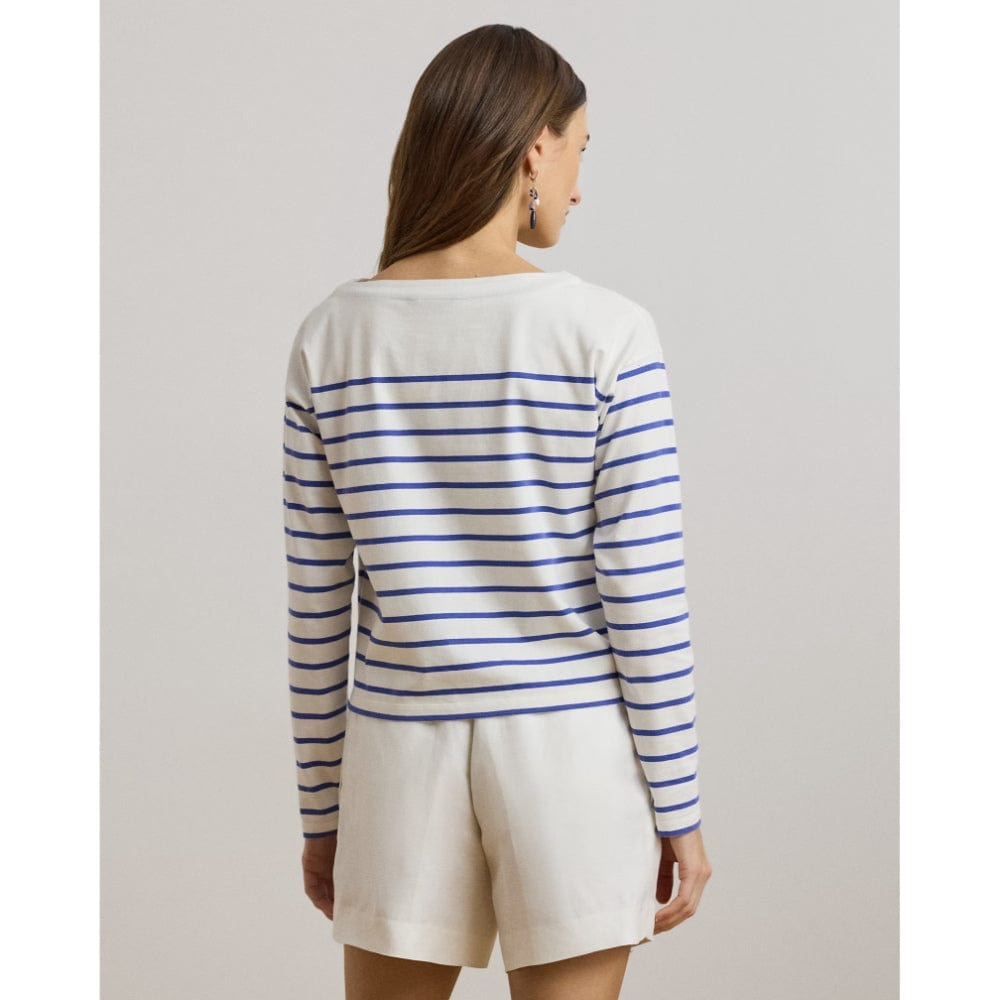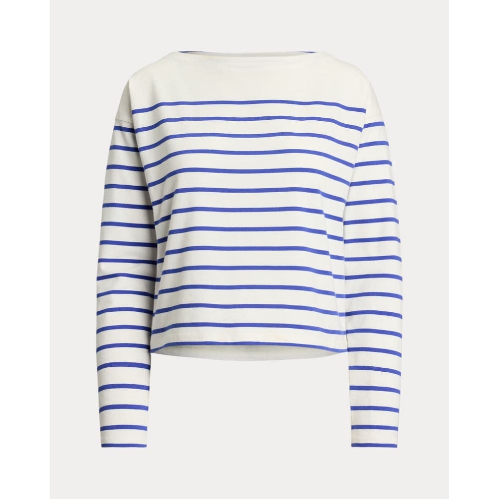 This boatneck top features yarn-dyed horizontal stripes that enhance its relaxed, slightly boxy shape. Crafted from breathable cotton jersey, it offers a soft, comfortable feel. The design is finished with Lauren’s signature embroidered logo on the hem. It has a relaxed fit that sits at the hip. Made from 100% cotton. The model is 178 cm tall and is wearing a size small.