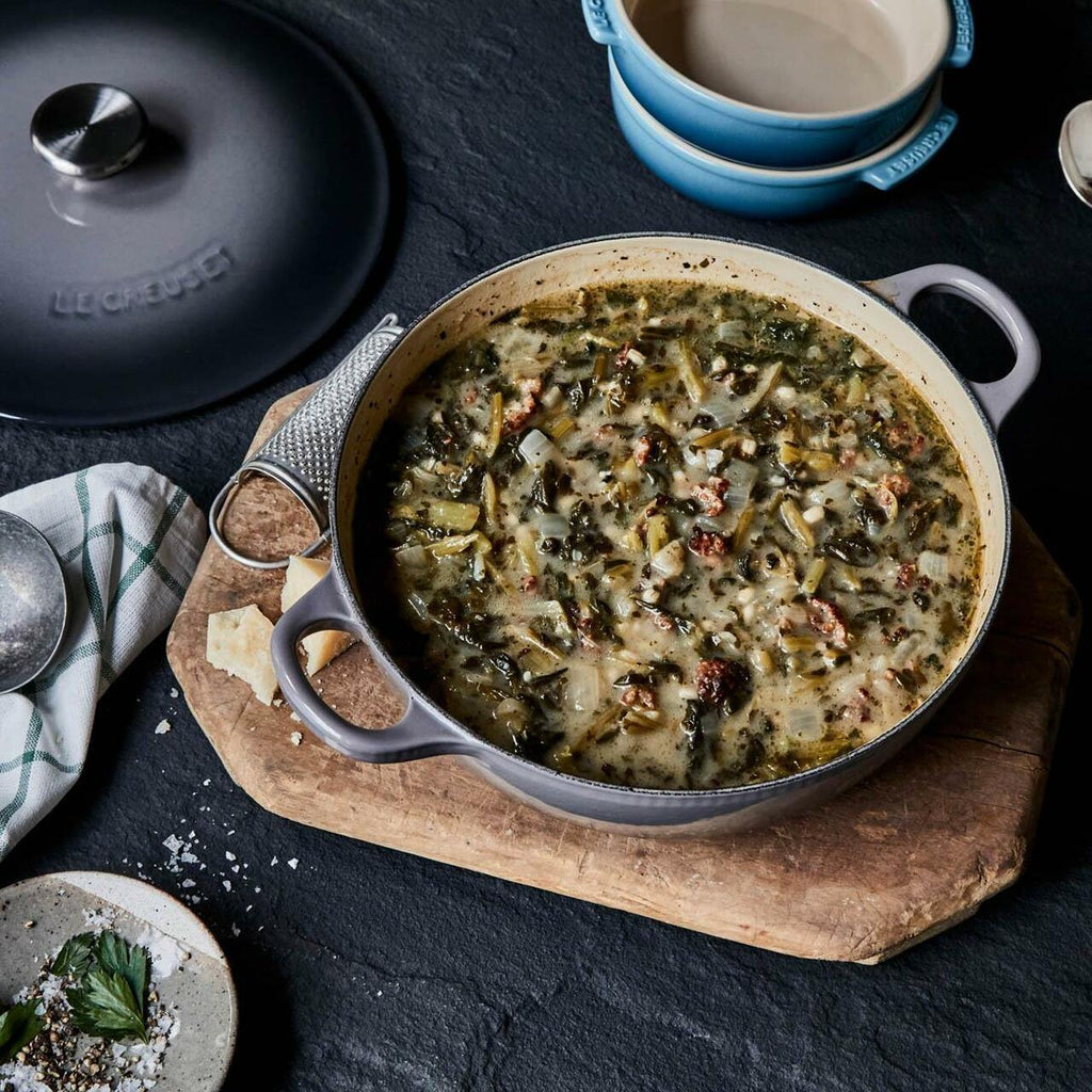 Although it's in the name. the Le Creuset 28cm Cast Iron Soup Pot in Flint is more than just a soup pot. This versatile piece of cookware can roast, fry and even bake your favourite meals. The sloped sides make it easy to stir and the cast iron construction ensures heat is spread evenly. Suitable for use on all hob types, including induction, the soup pot has a hygienic enamel surface that resists chipping, staining and dulling.