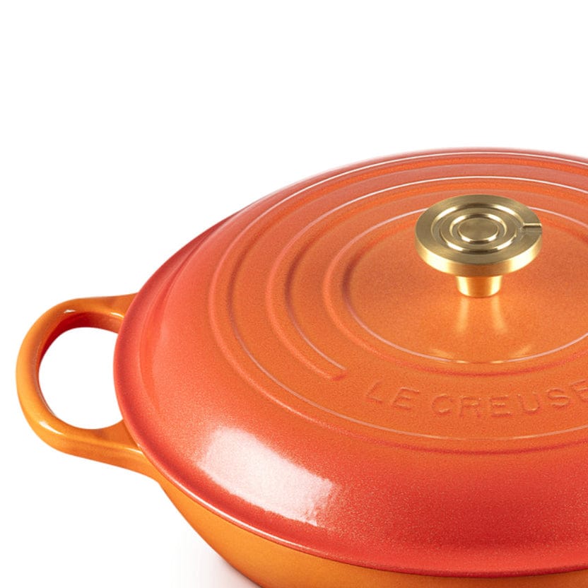The Signature Shallow Casserole in the limited-edition Flamme Dorée balances tradition and innovation. It heats evenly, transforming meat and vegetables into tender dishes. The wide base allows single-layer searing, while the domed lid locks in moisture and flavour. It glistens as it seamlessly goes from stove to oven to table.