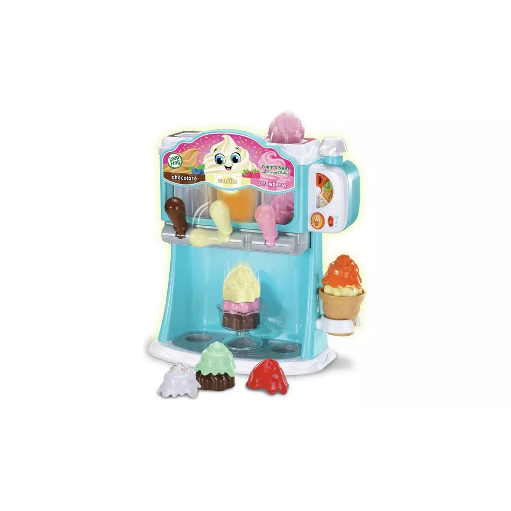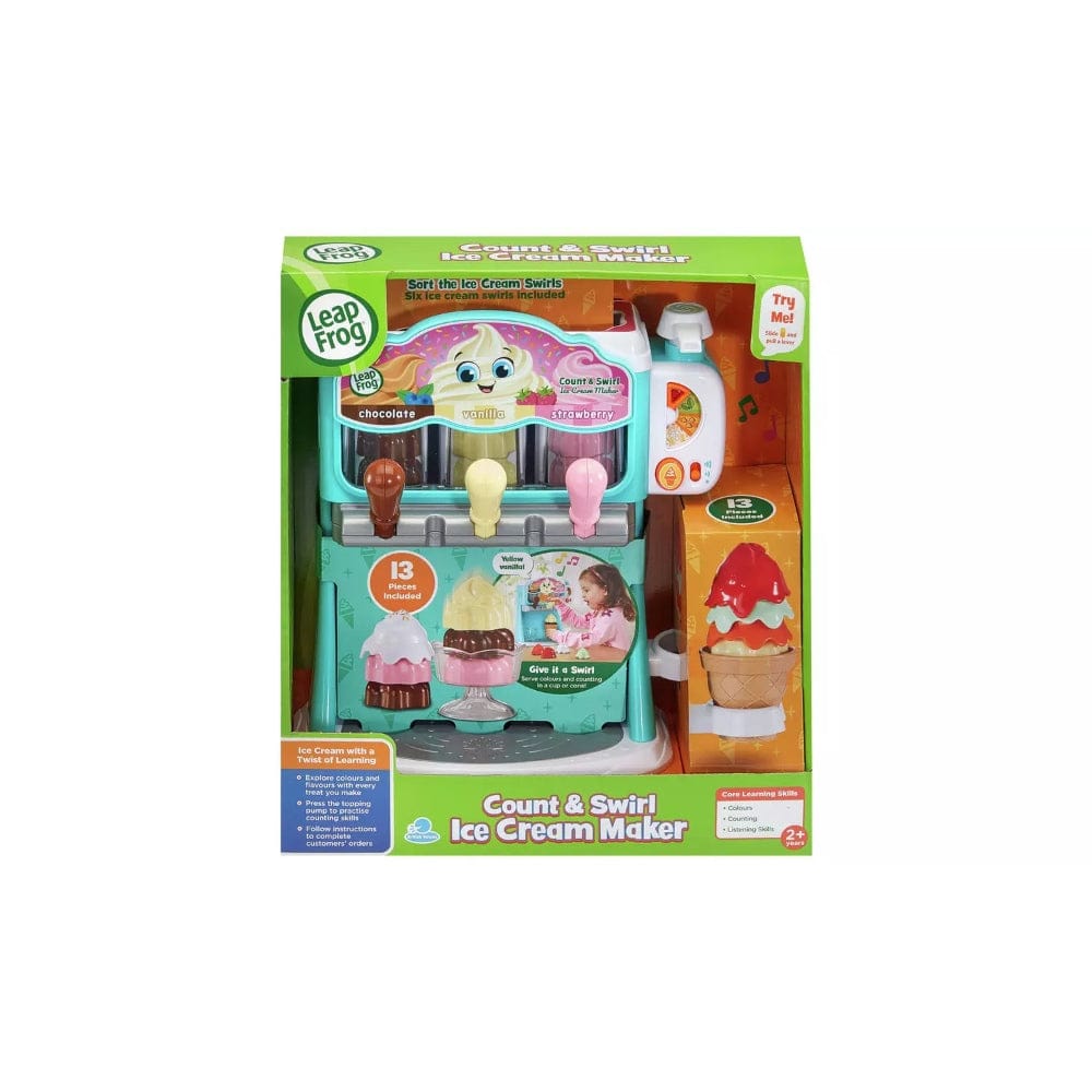 This retro ice cream machine comes bundled with 12 pretend accessories for fantastic role play fun. Press the customer order button to hear pretend customer orders and then pop the 6 ice cream swirls into the top of the machine and get ready to serve. Pull the levers to release the ice cream into the cone or cup and learn ice cream colours and flavours. Toggle the topping switch to select one of four delicious toppings and to top it all off add some syrup – you choose the flavour!
