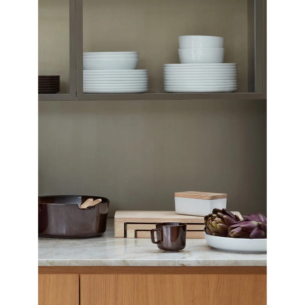 A set of two porcelain tea/coffee cups with a tapered form and angular handle. Versatile and contemporary tableware designed for different environments and occasions. Made from vitrified porcelain that is dishwasher and microwave safe.