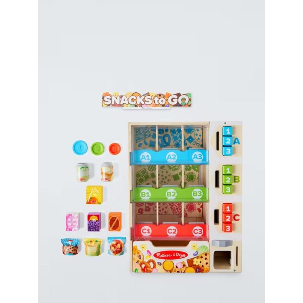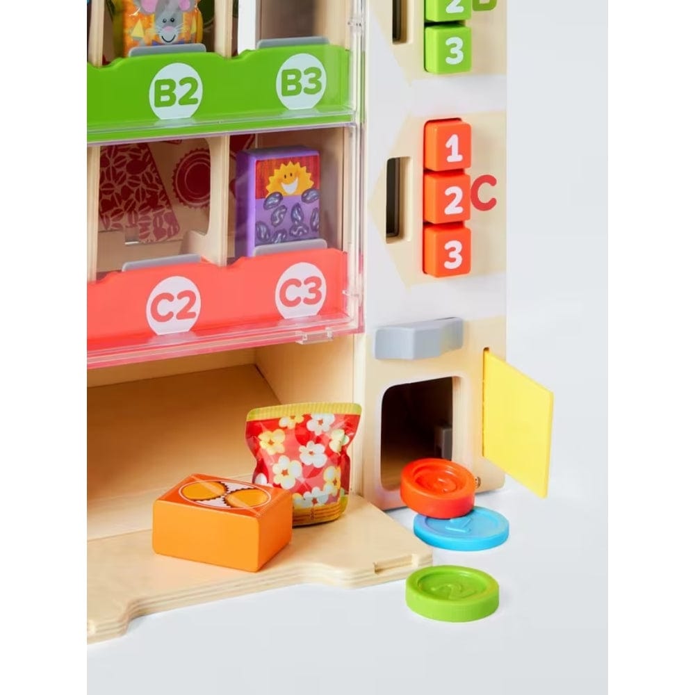 Satisfy hungry imaginations with the push of a button! Open up the back of the unique wooden vending machine from Melissa & Doug and stock it with nine double-sided play food packages, including snack bars, drinks and pouches.