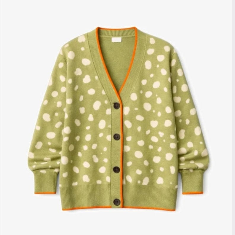 Never Fully Dressed brings understated elegance to everyday layering with this fawn jacquard cardigan in rich olive. The low-cut v-neckline creates a flattering silhouette, while the intricate jacquard weave adds visual interest and texture. Perfect for effortless sophistication, whether styled over a crisp shirt or paired with a simple tee. A versatile wardrobe essential that transitions seamlessly from season to season.