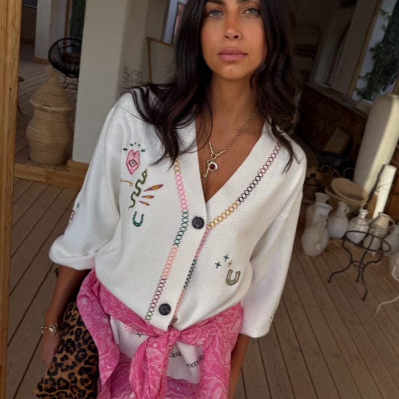 In our bestselling soft touch knit base with criss cross stitch detailing along the the front hem and a mixture of classic and new western motifs in a range of deep tones. Designed to be styled in a multitude of ways, we've paired with our pink paisley dorris skirt for an effortless everyday look.