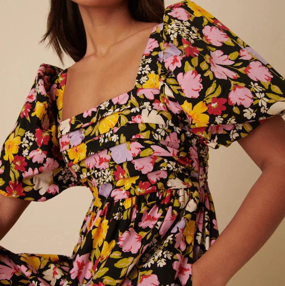 Nova, you’re a dream. She’s a stylish smock dress that we think you’ll love, now in oversized florals. We love the square neckline with statement-making puff sleeves and a pleated skirt. We’ve added a touch of shirring at the back for an always perfect fit. Finish with stompy sandals.