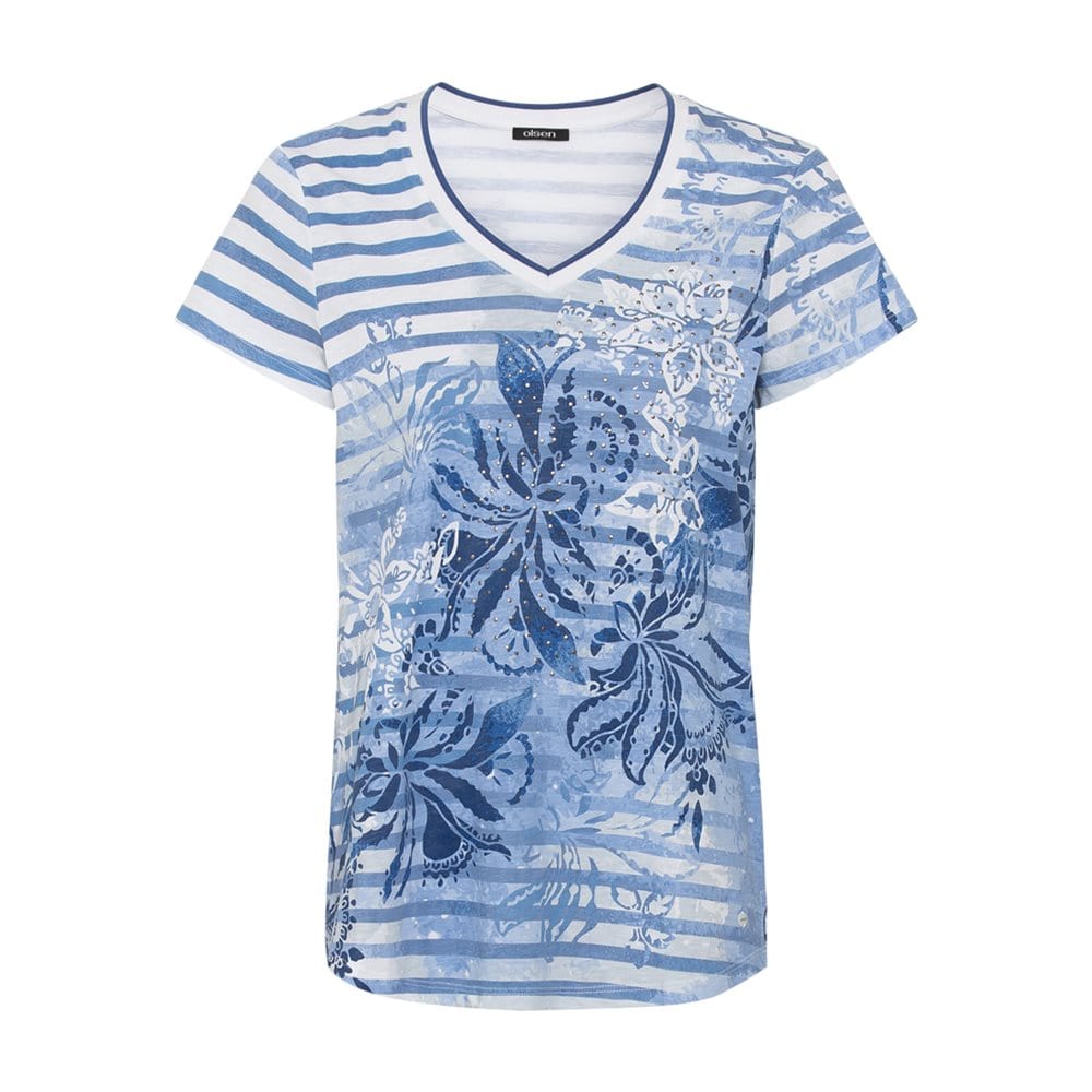 In addition to the imaginative print mix of flowers and stripes, small decorative stones set fashionable highlights in this straight-cut shirt. Made of pure cotton, the shirt is super comfortable on the skin. The sporty touch is provided by small side slits and a V-neck decorated with ribbed decorative ribbon.