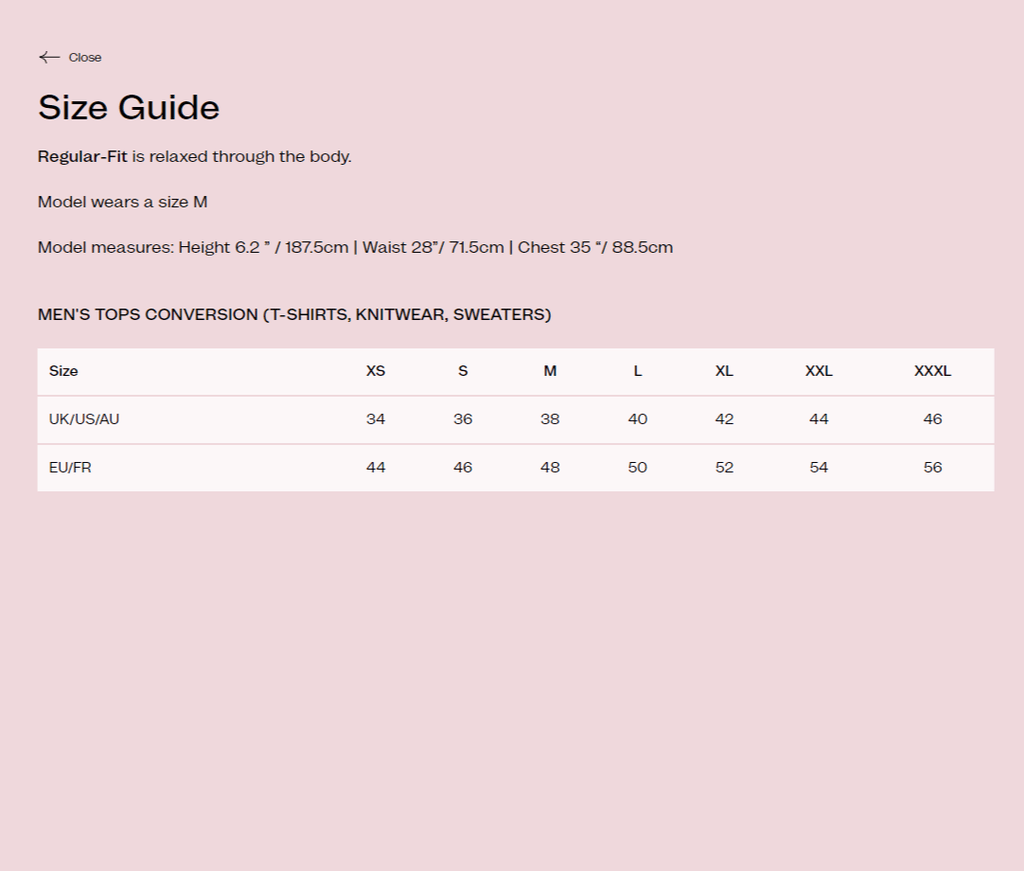 - Model measures: Height 6.2 ” / 187.5cm | Waist 28”/ 71.5cm | Chest 35 “/ 88.5cm